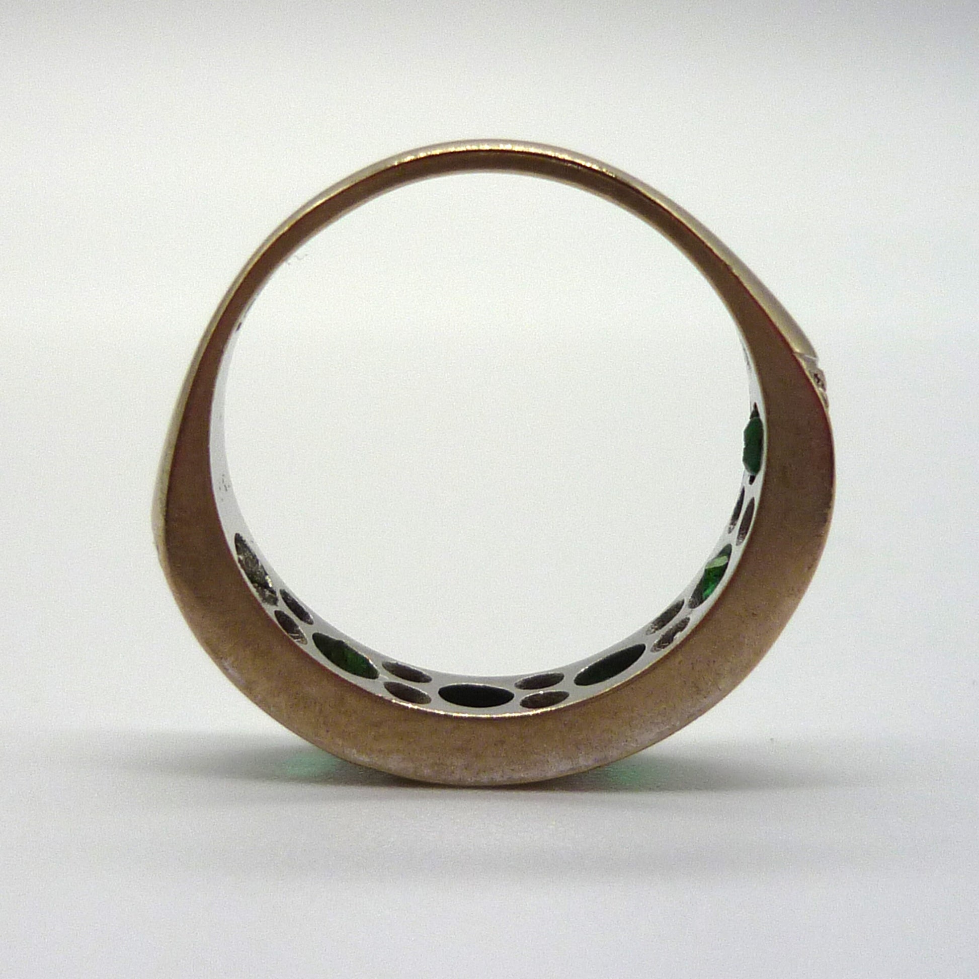 A couple of the emeralds have sunk slightly in their settings, most notably one of the outer ones. This is not noticeable when it is on the finger. The inside of the ring looks quite crude, it appears that the reverse of the gems has been built up in places to prevent any further movement.