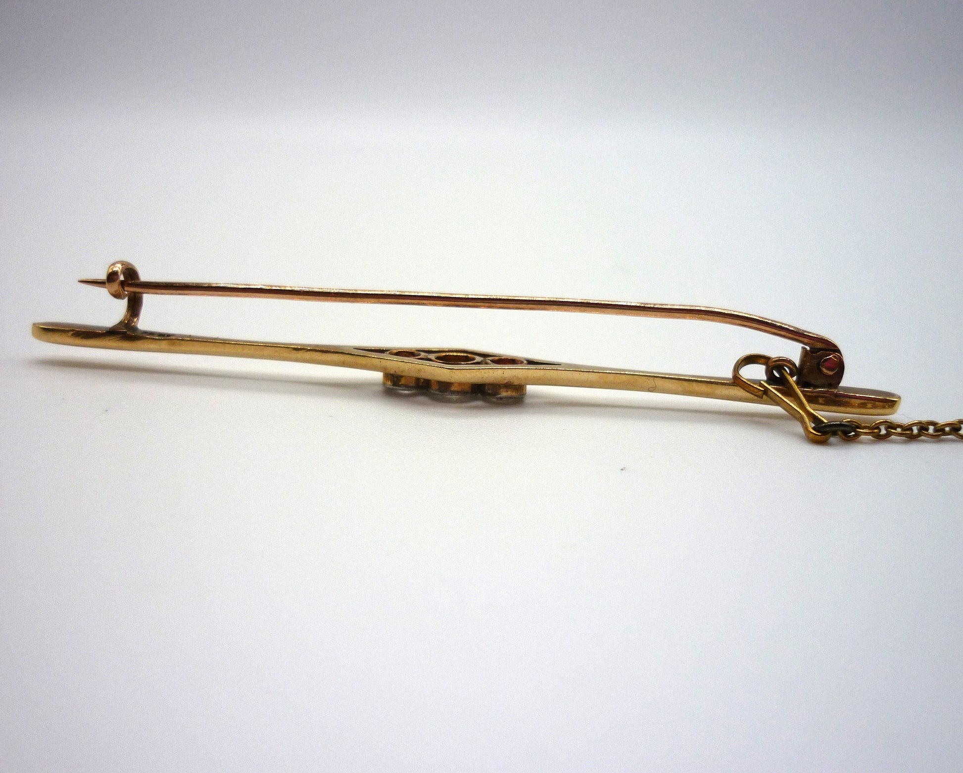 Antique 15ct Gold Bar Brooch with 3 Old Cut Diamonds