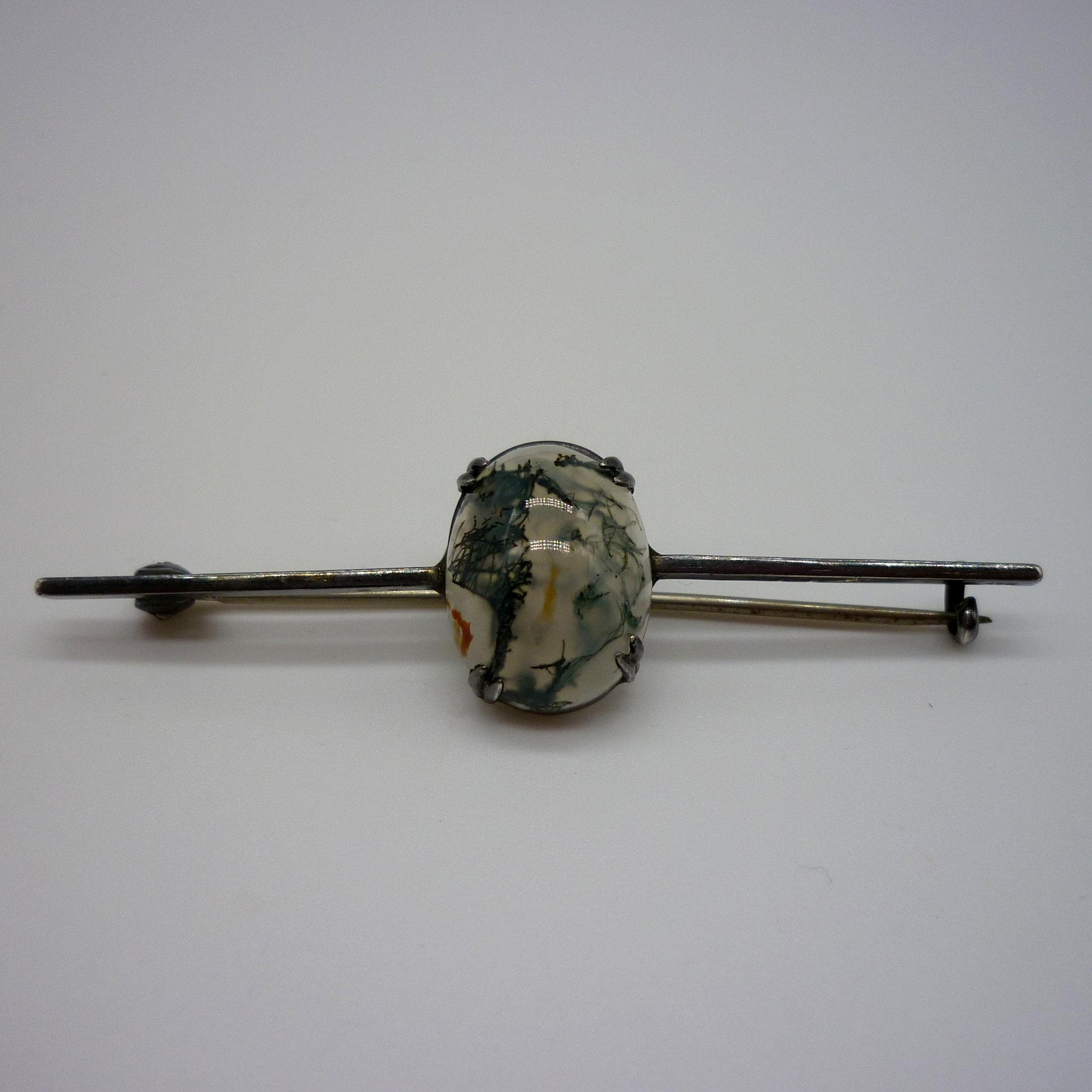 Antique 935 Silver Bar Brooch with Moss Agate Cabochon
