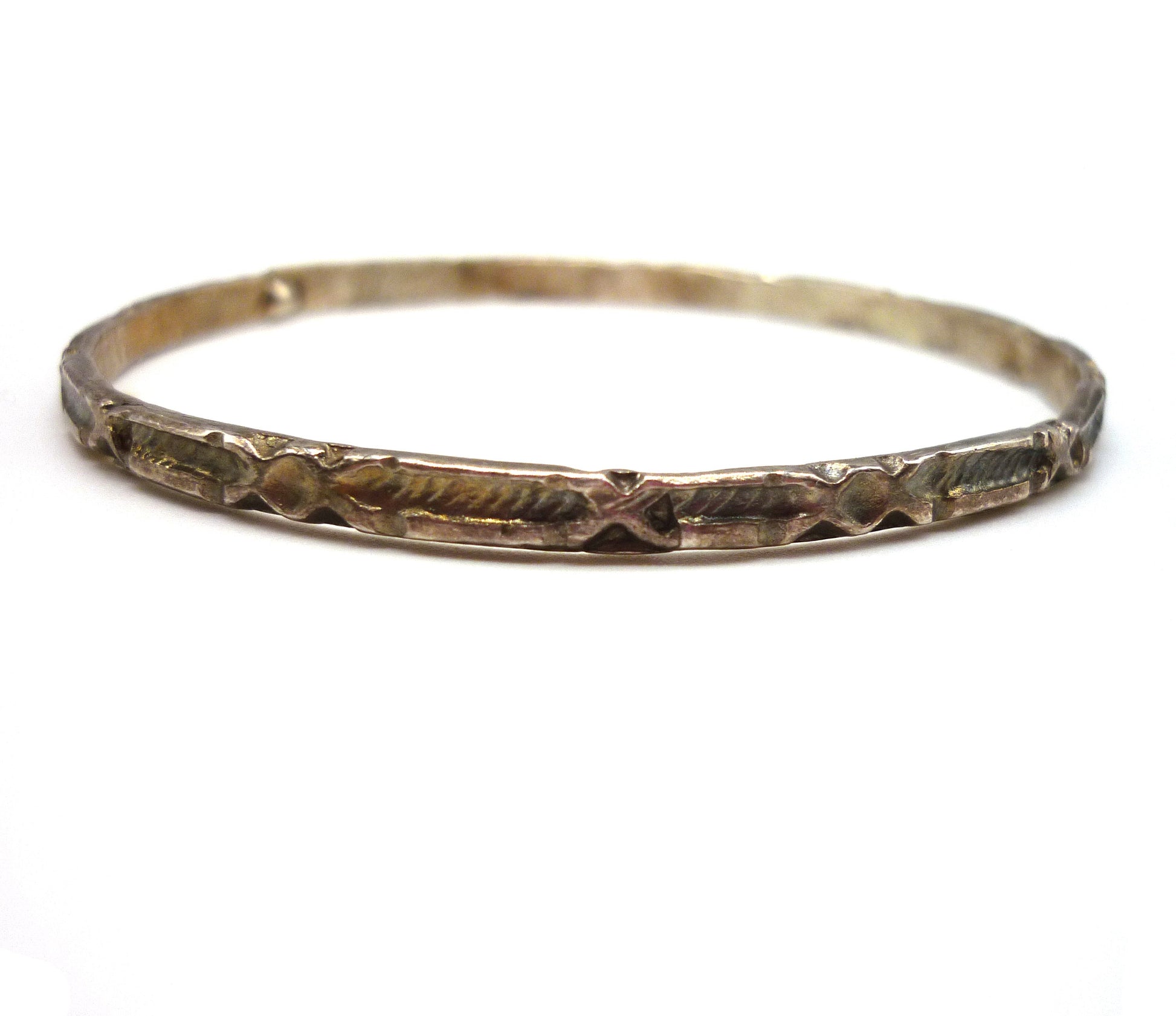 Antique Silver Bangle with Geometric Pattern, Thin Stacking Bracelet