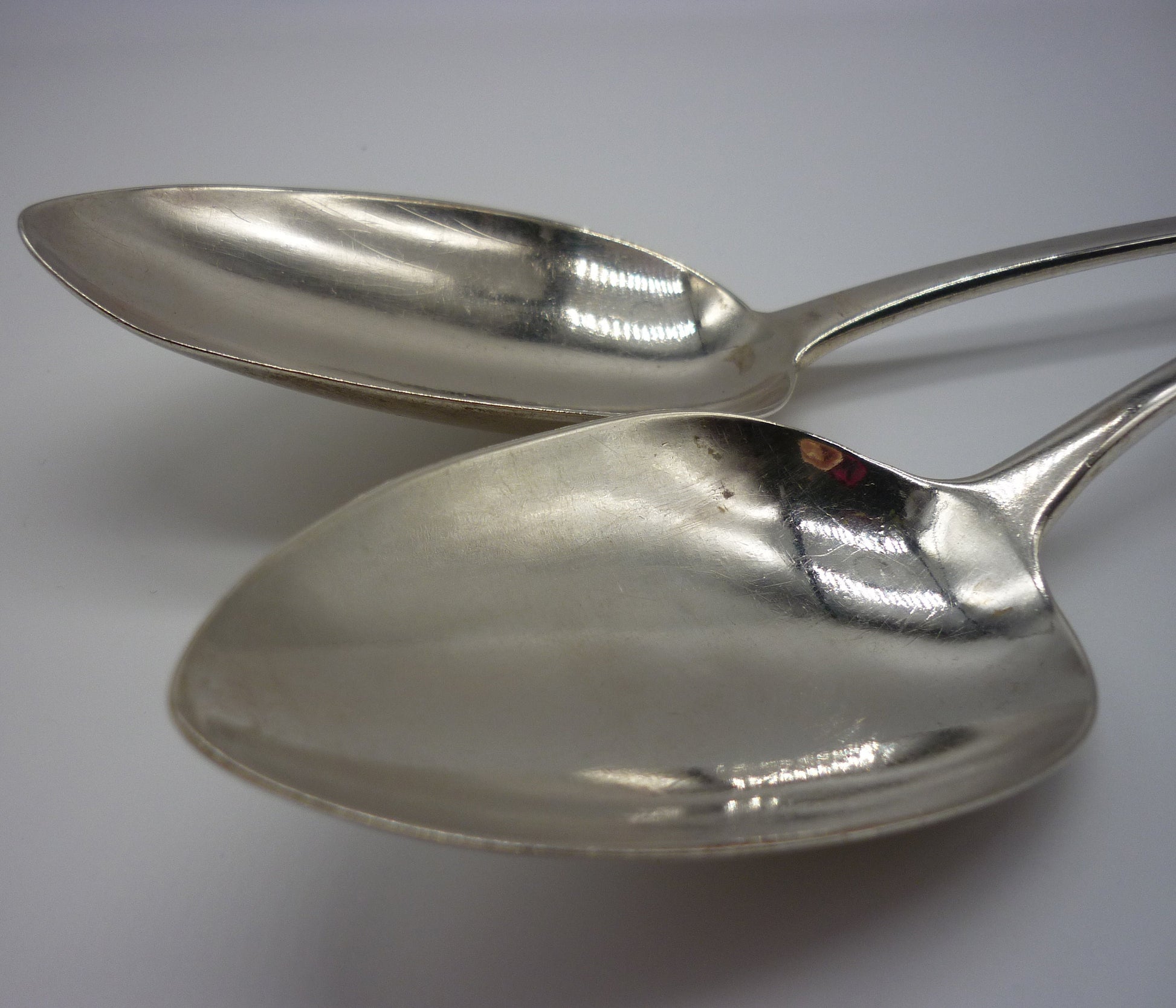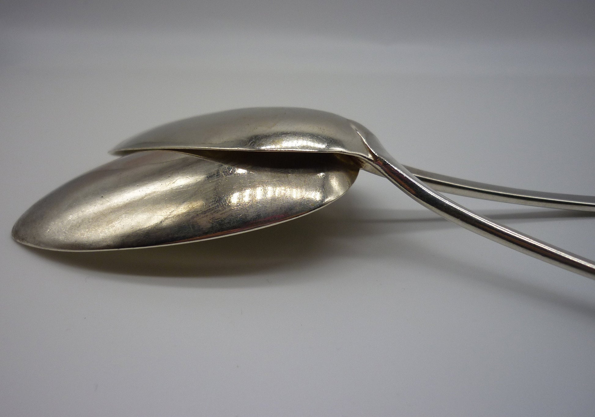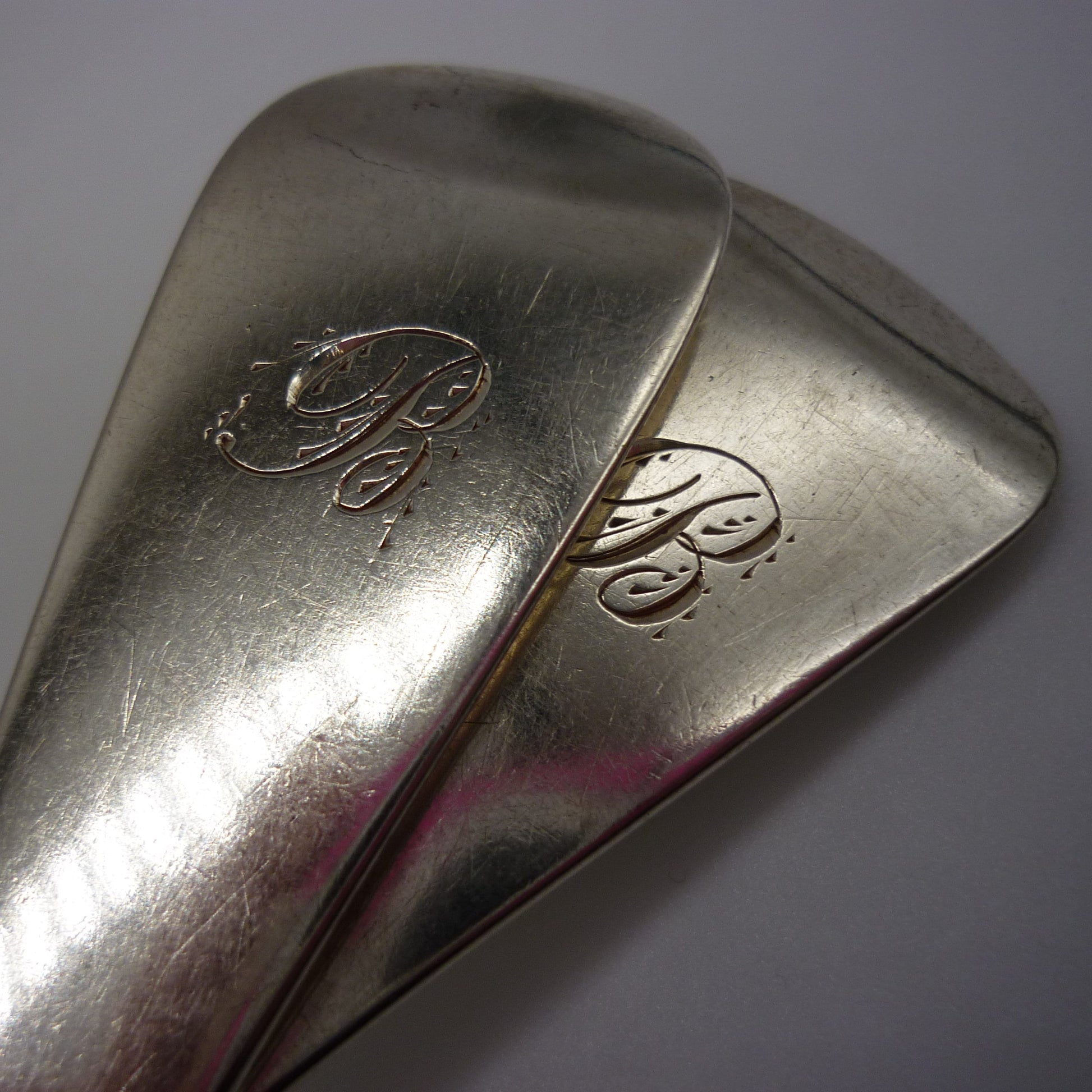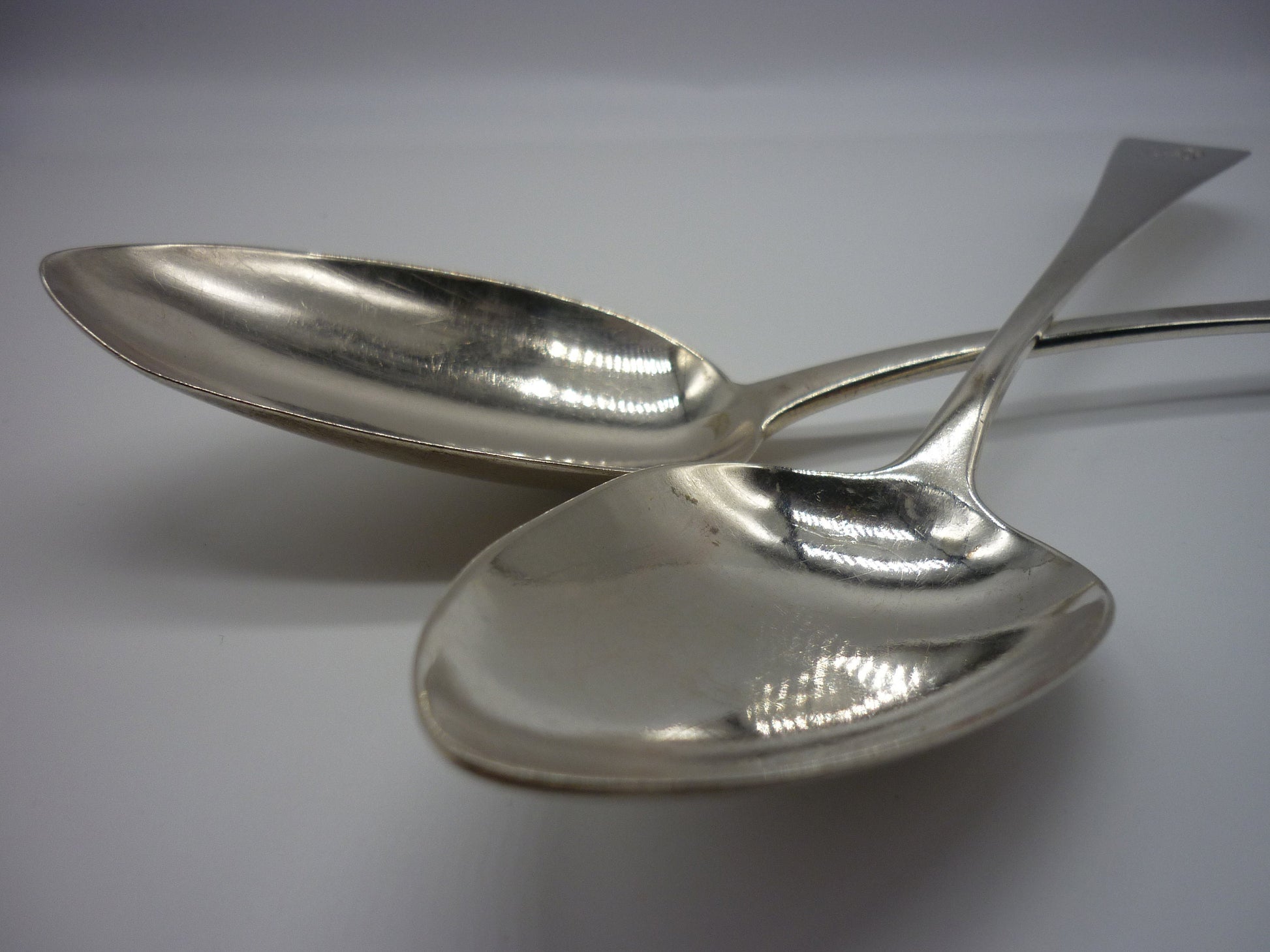 Pair of large antique silver tablespoons, engraved with matching letter B's to handle. Both George III serving spoons are in the Old English style, there is a very slight variation in shape, mostly at the tip of the handle but this is not really noticeable and they are well matched. One is very slightly longer than the other. They are both in good condition with light wear through age, one of them has some slight distortion to the tip of the bowl; please see photos for details.
