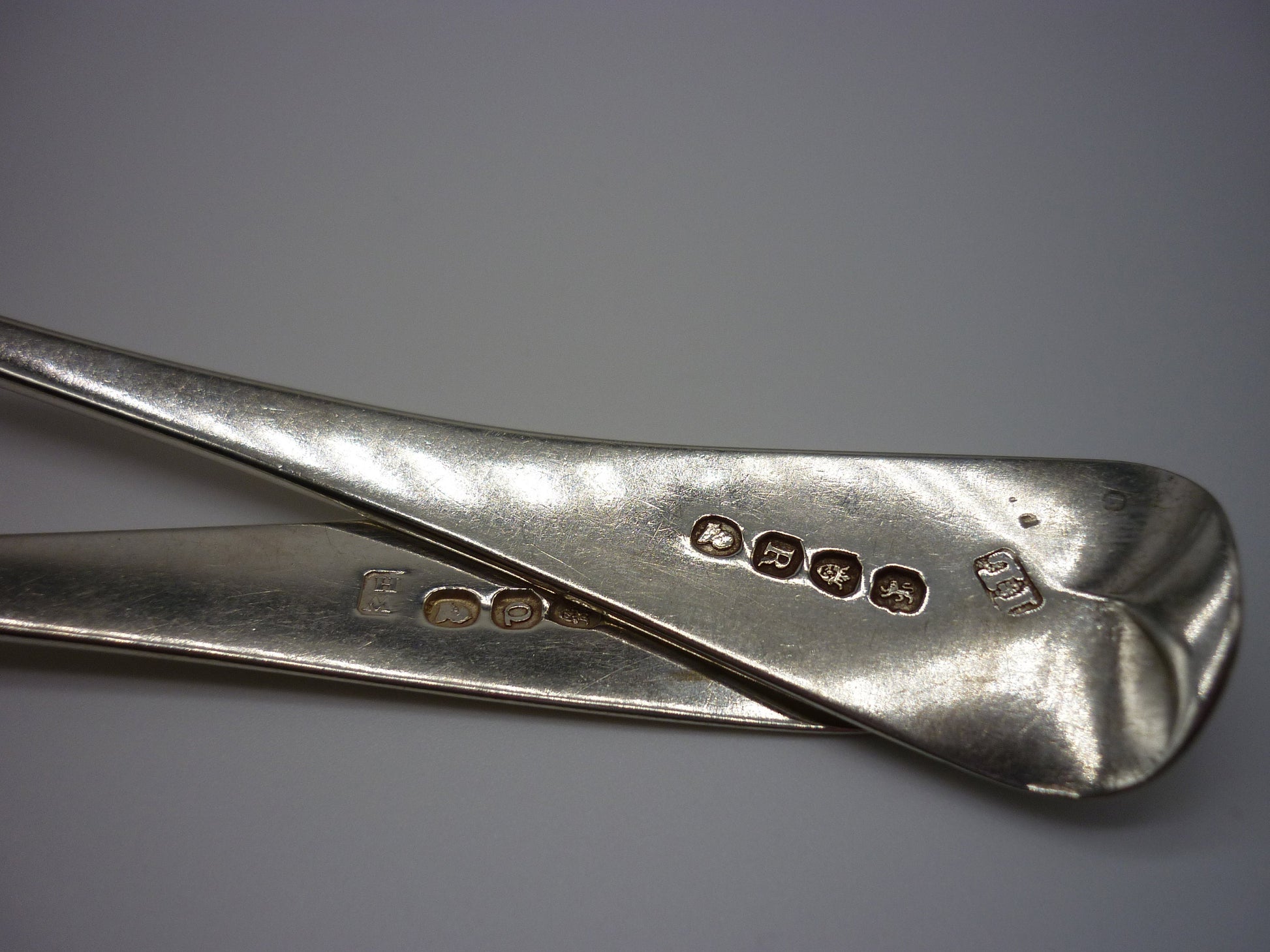 One spoon is hallmarked 1811 London and stamped with maker's mark of either HM or WH. It's length is approx. 8.5 inches. The other is hallmarked 1812 London and maker's mark for John Lias. It's length is approx. 8.75 inches