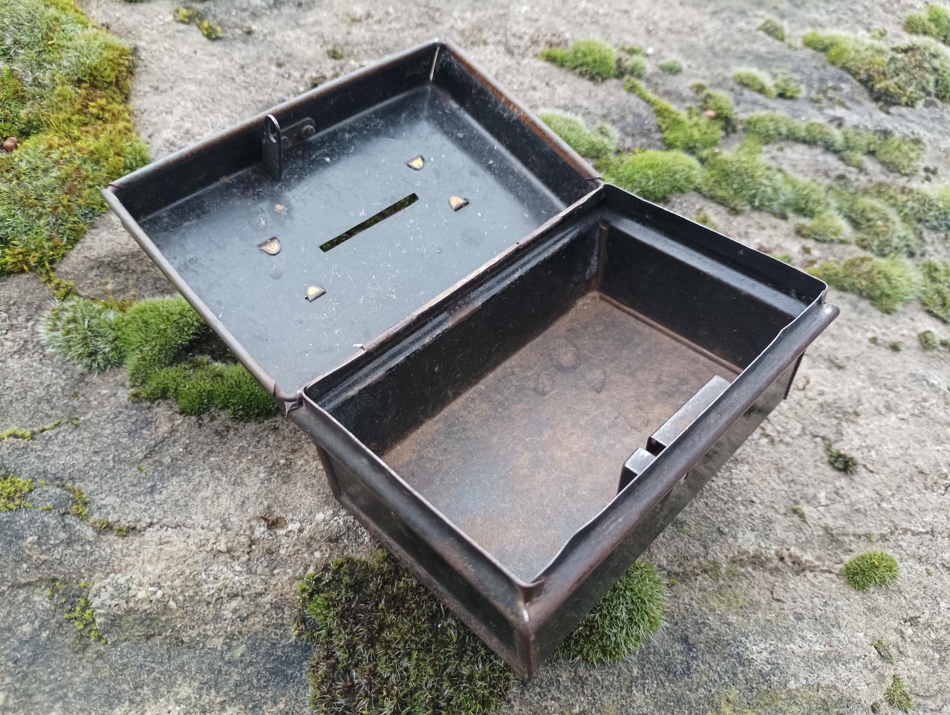 Vintage black metal money box with slit for coins. The box measures approximately 4 inches long, 2.5 inches wide and 2 inches tall.
