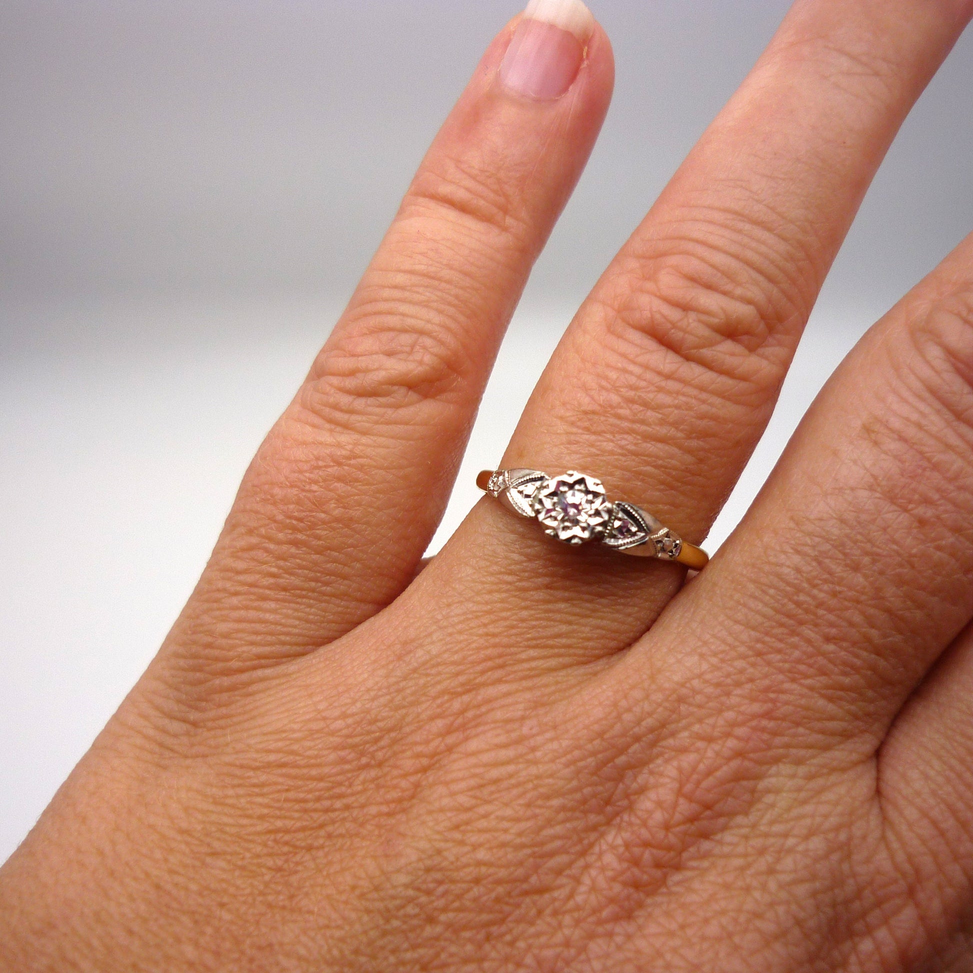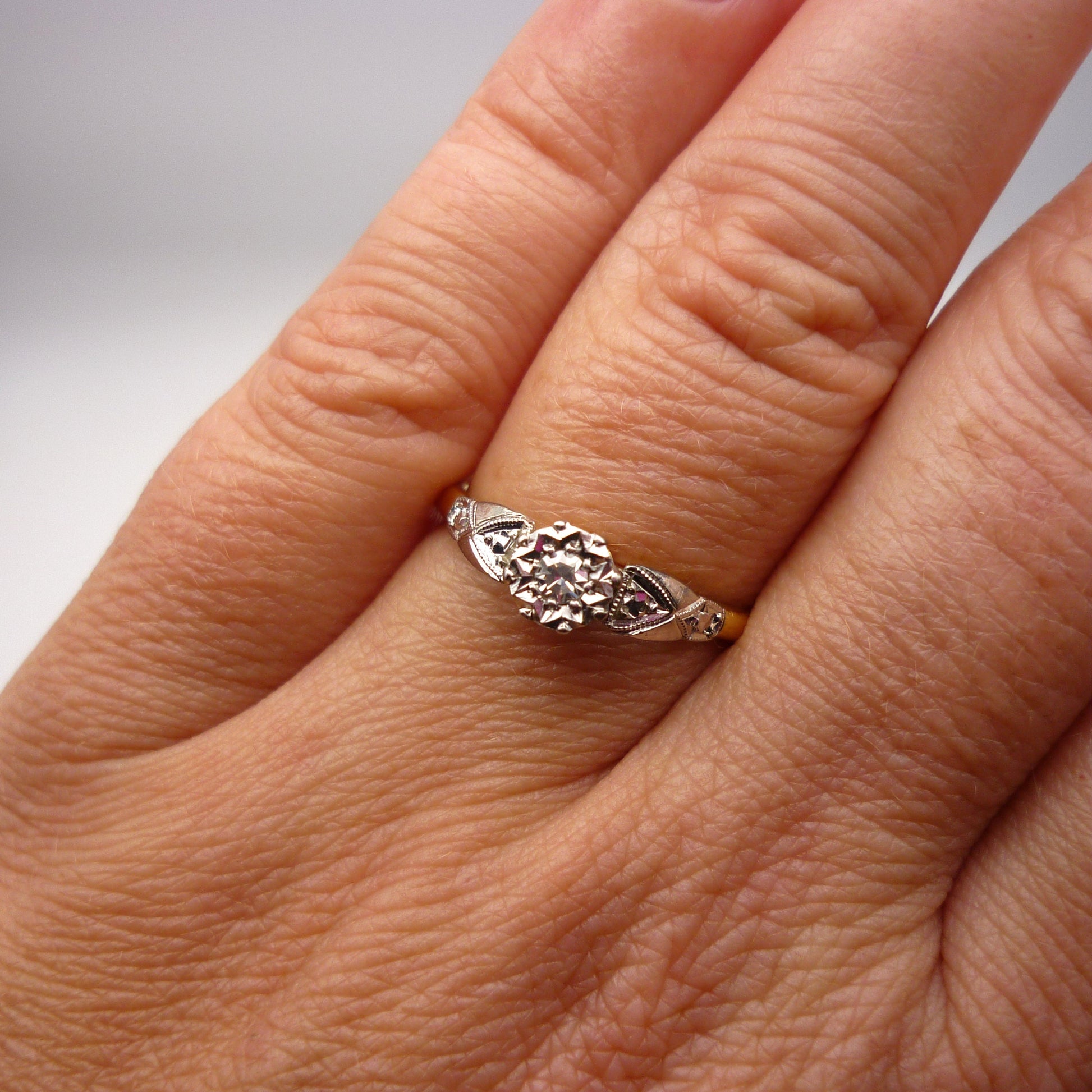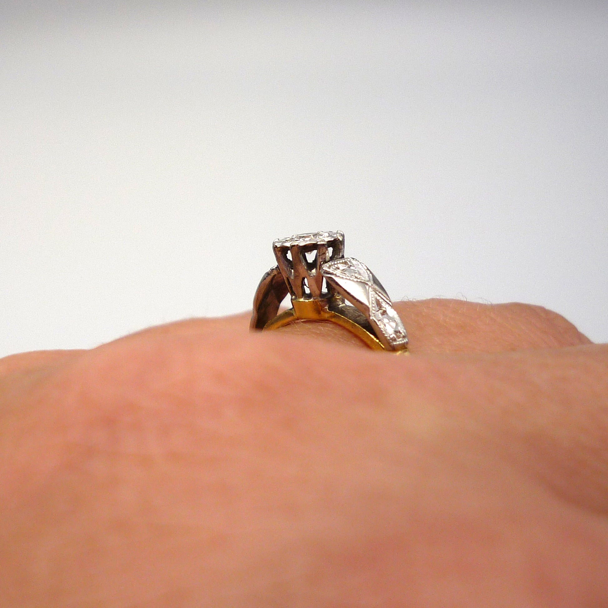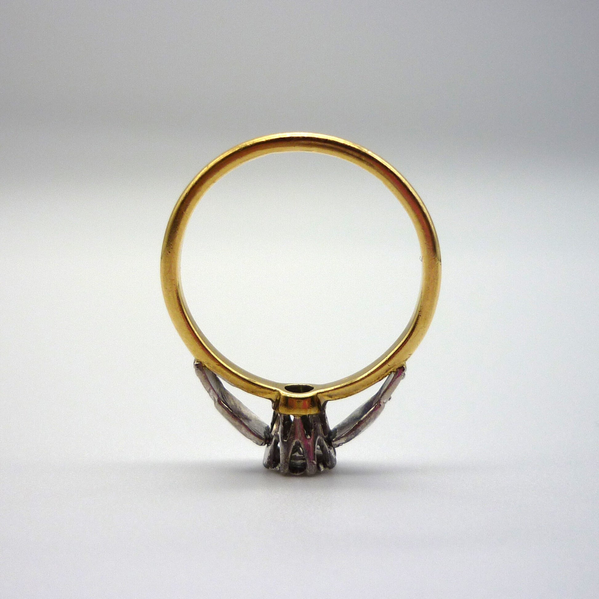 An 18ct yellow gold and platinum tipped diamond solitaire ring with an unusually high cathedral setting. The sweet and sparkling little diamond (approx. 0.05ct) is illusion bezel set in a high open gallery that sits approx. 1cm off the finger, raised upon ornate platinum shoulders above a dainty yellow gold band.