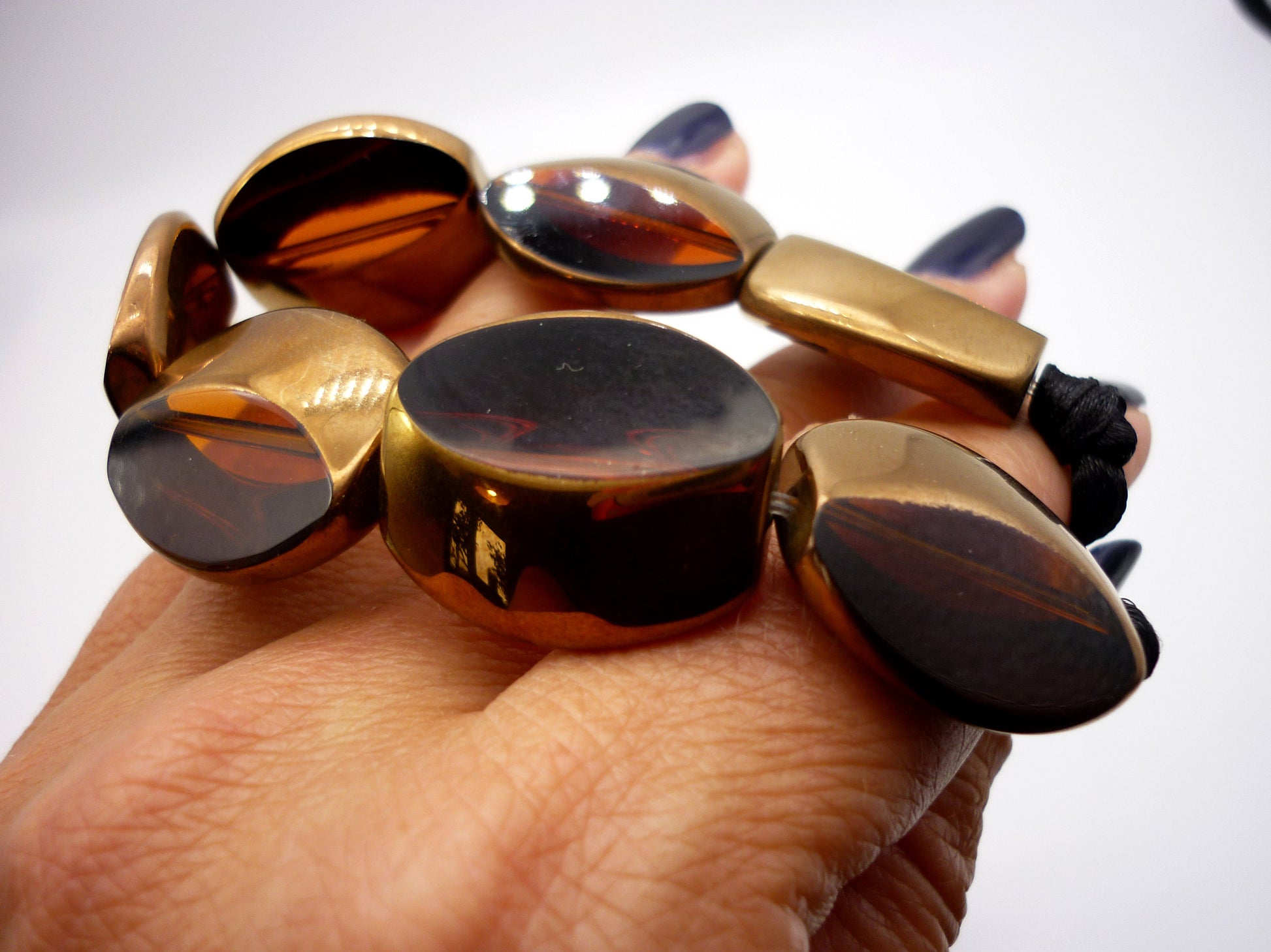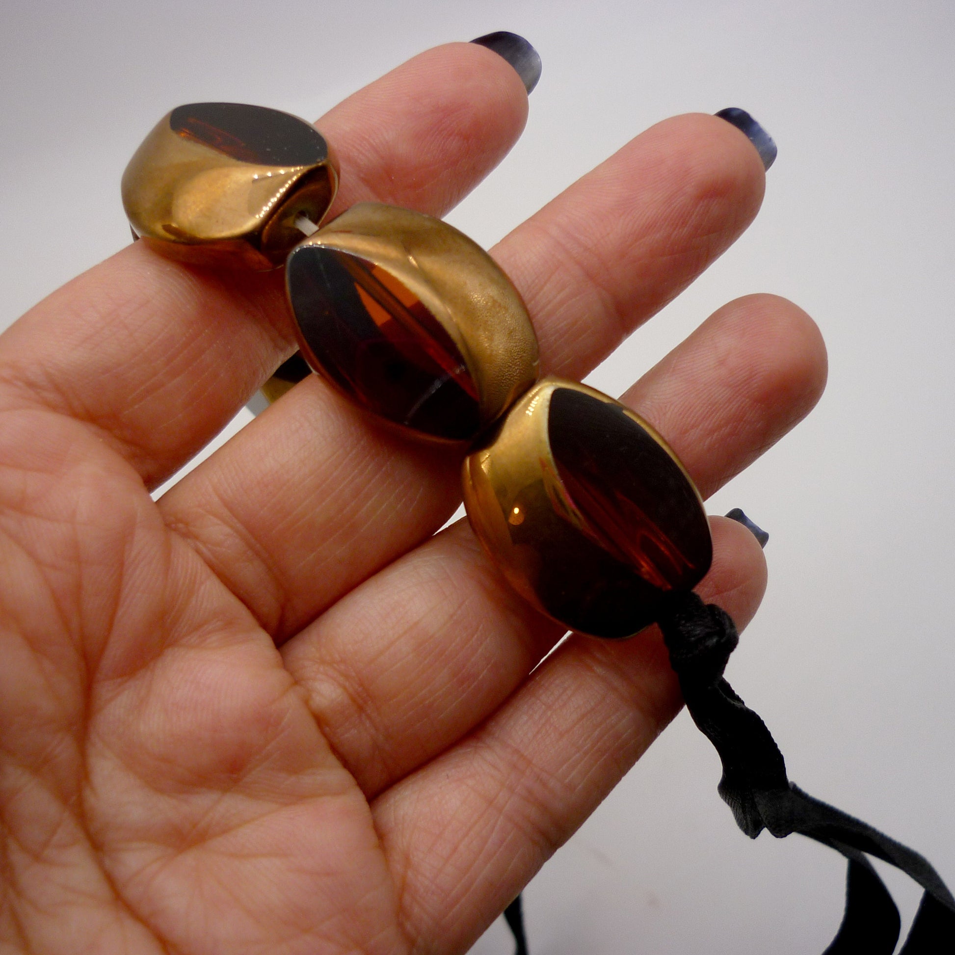A vintage beaded bracelet, with iridescent coppery brown plastic beads. Ties shut with a black ribbon, could perhaps also be worn as a choker.