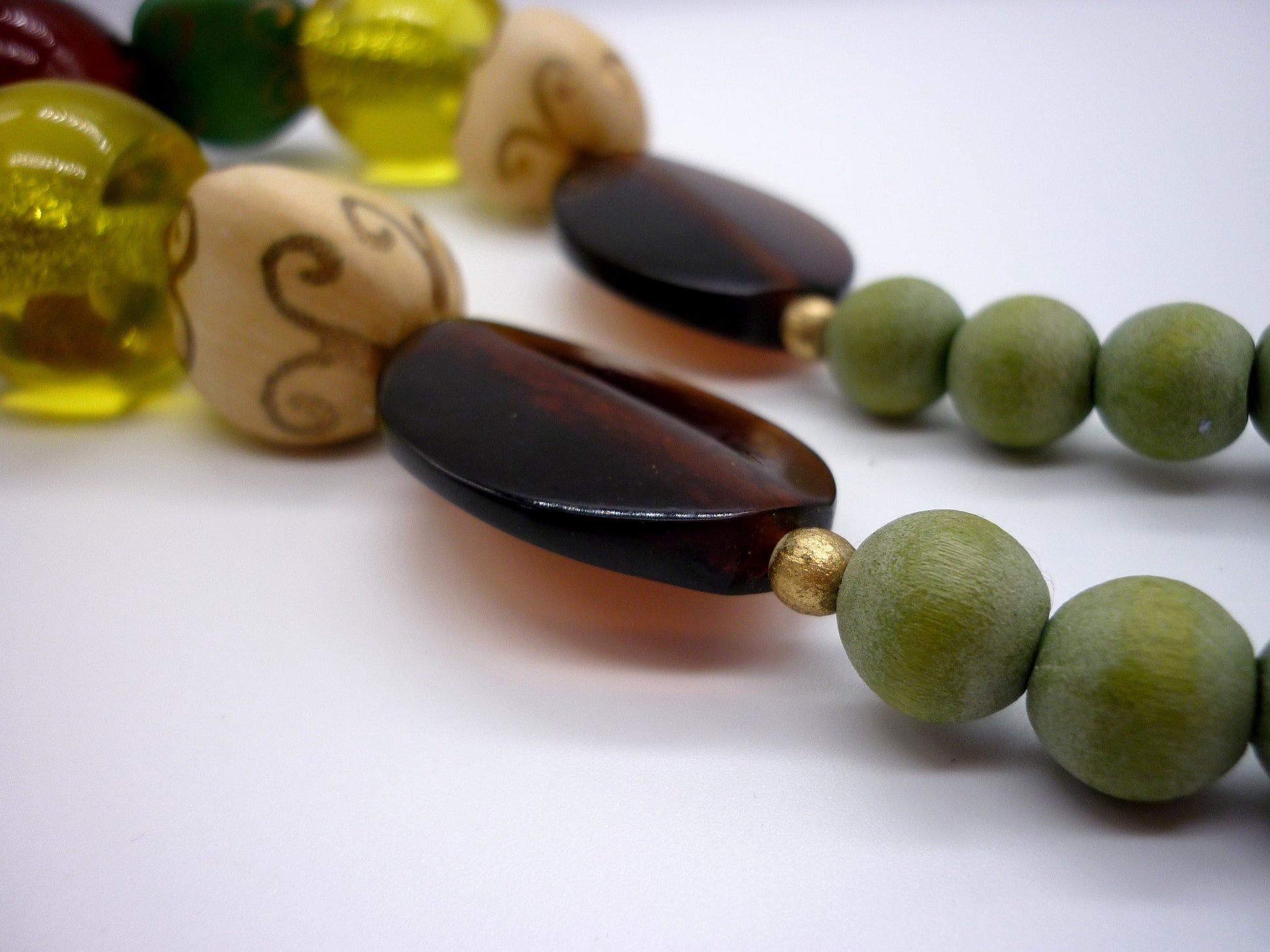 A chunky multi coloured beaded necklace, with a mix of wooden and plastic beads in a variety of shapes.