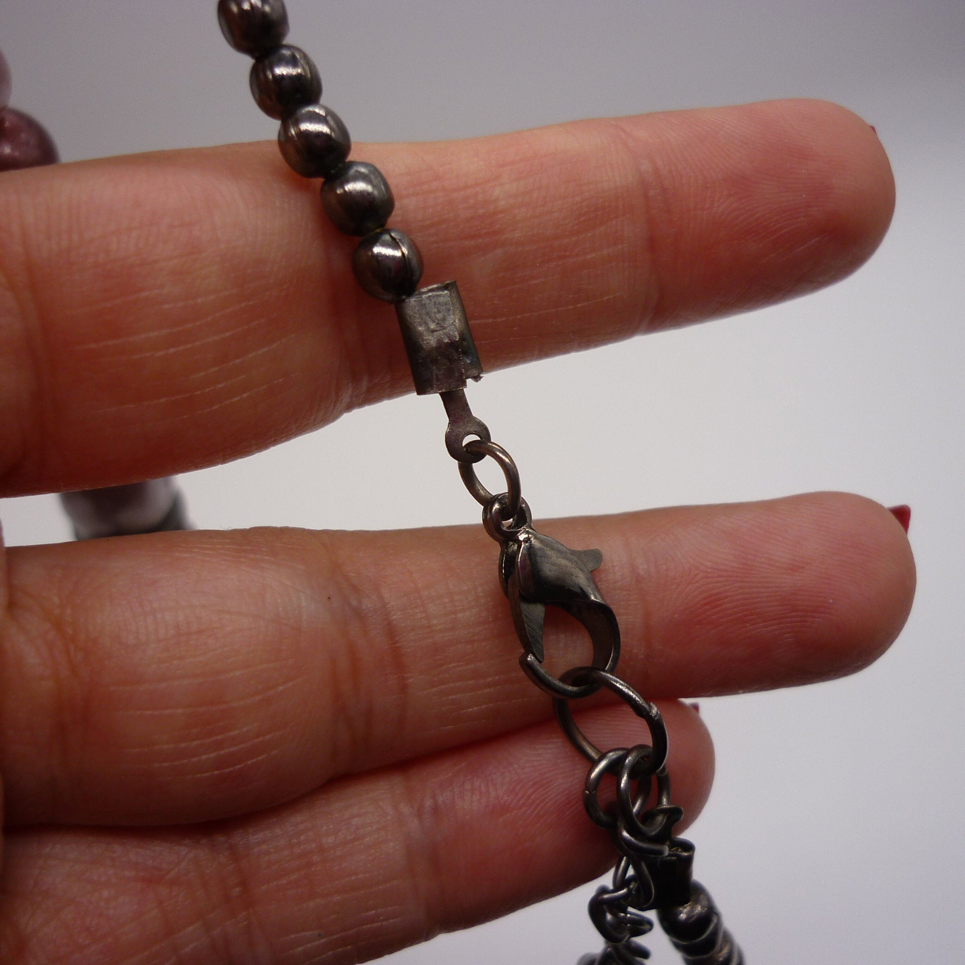 Measures 23 inches with a 2 inch extension chain taking it to 25 inches. In good condition with some surface wear to the beads.