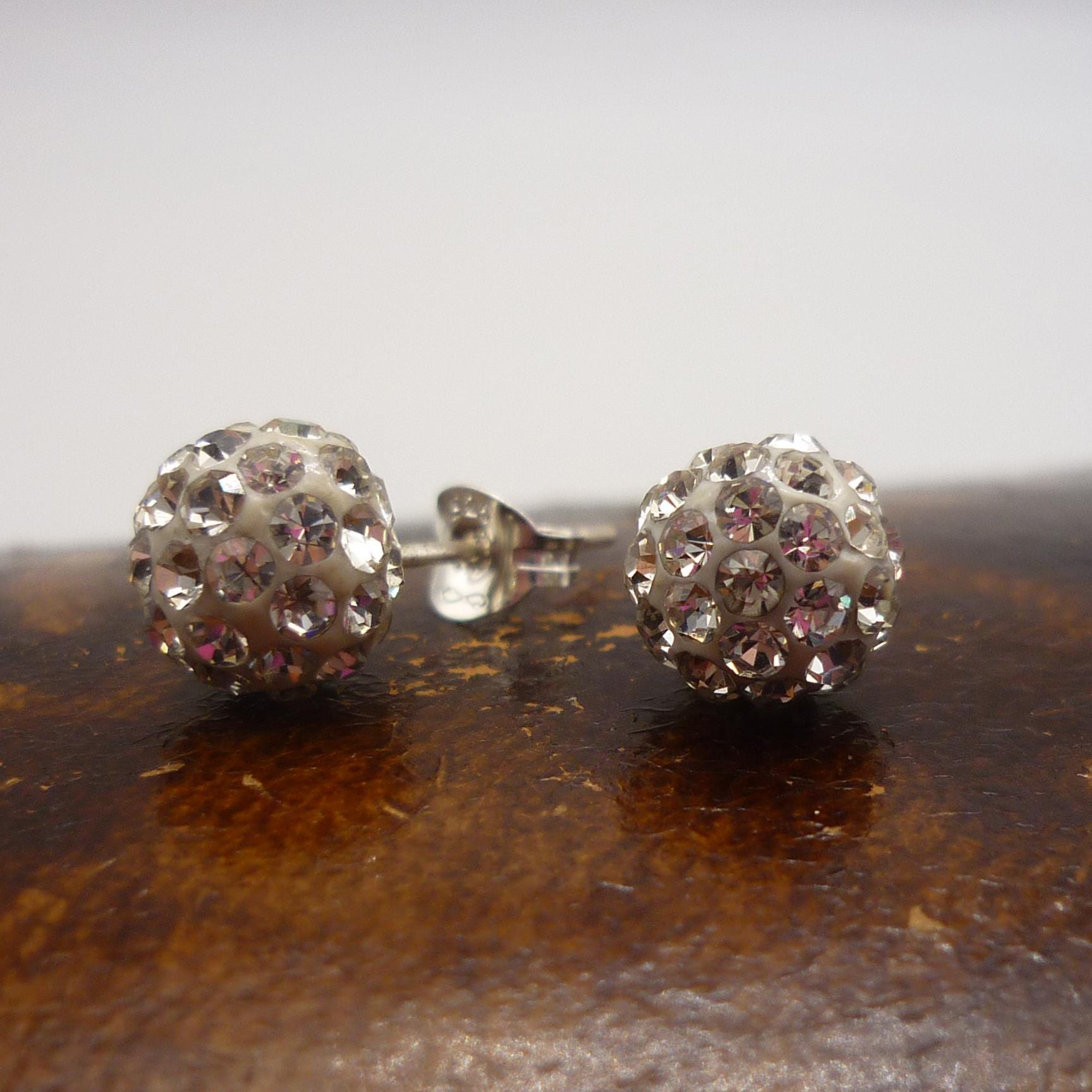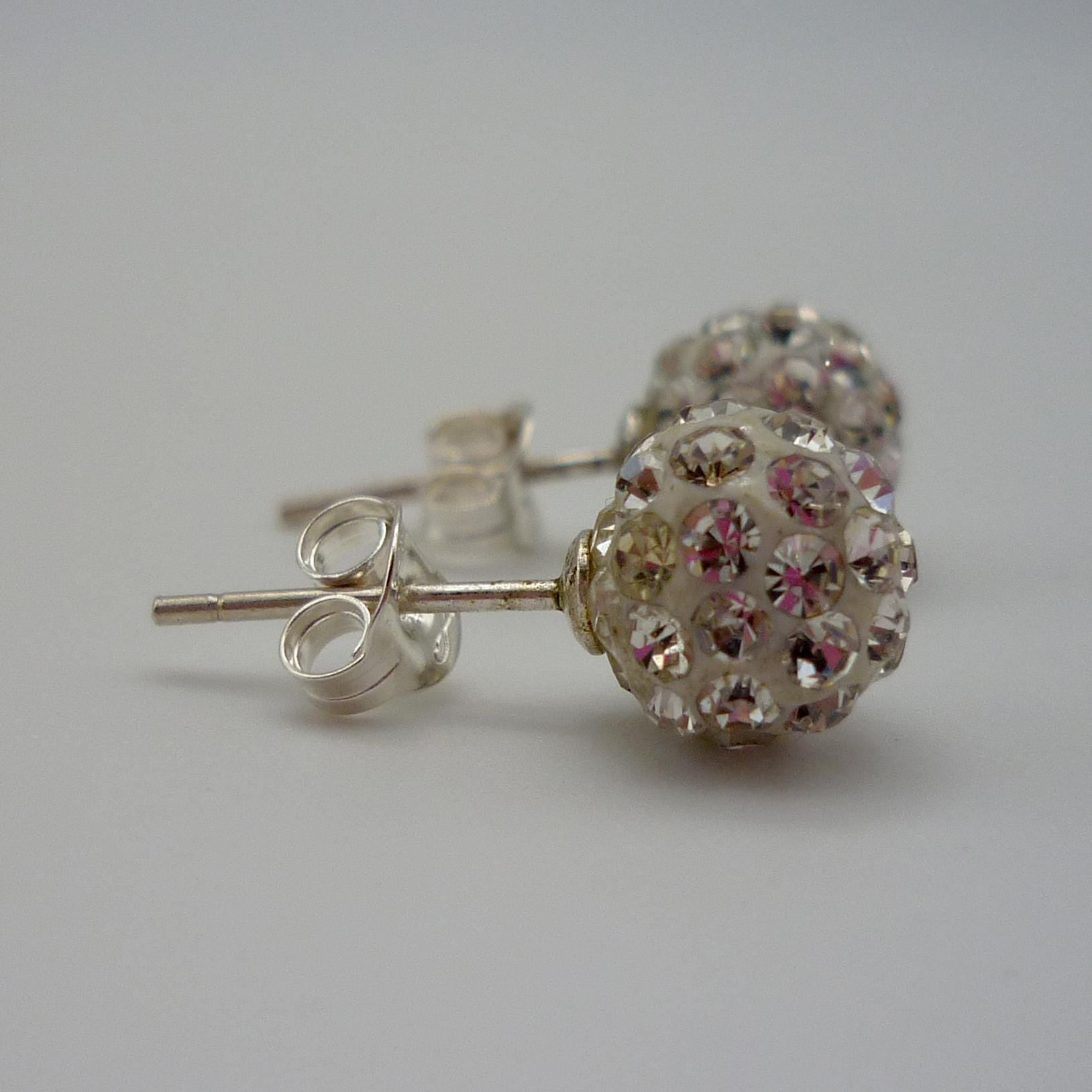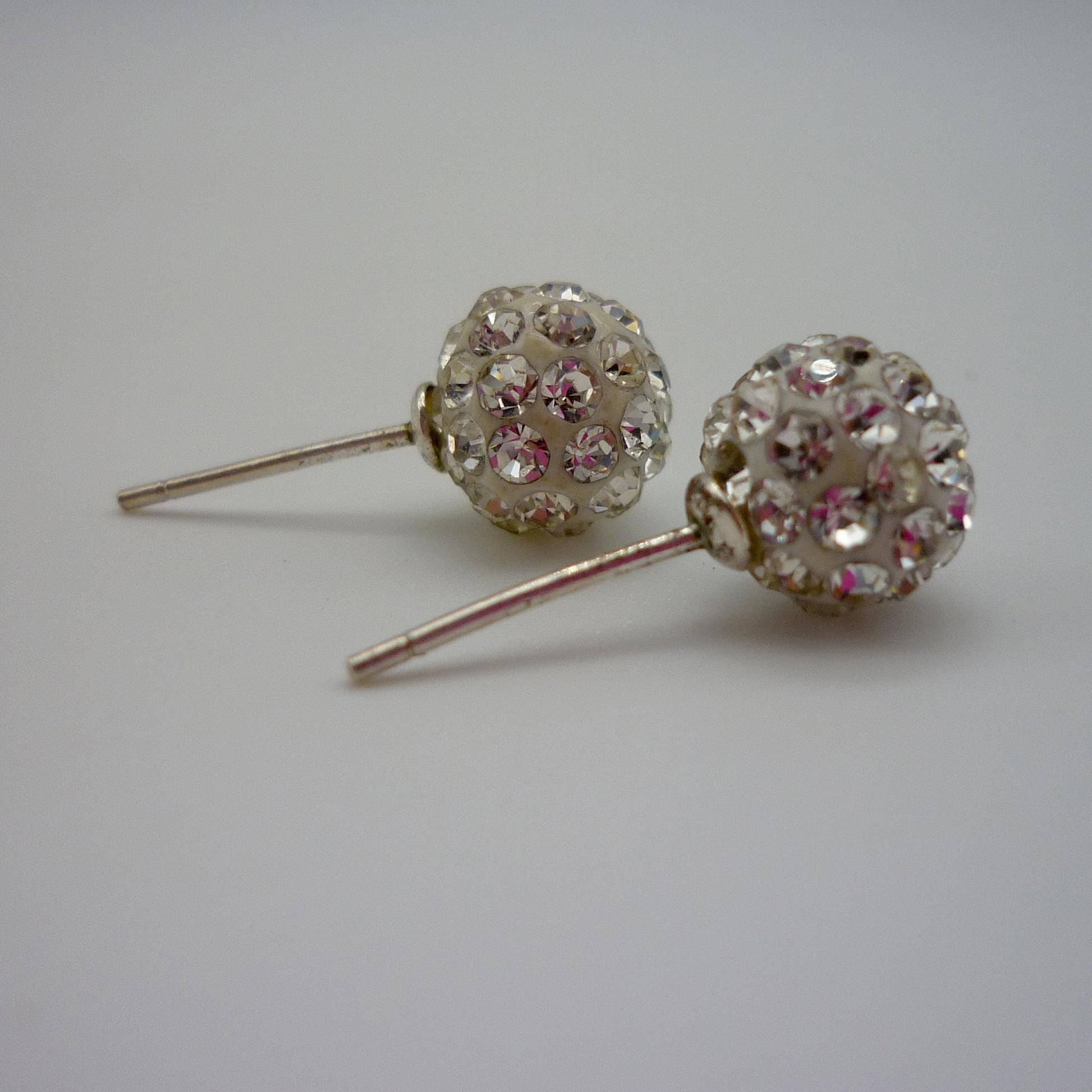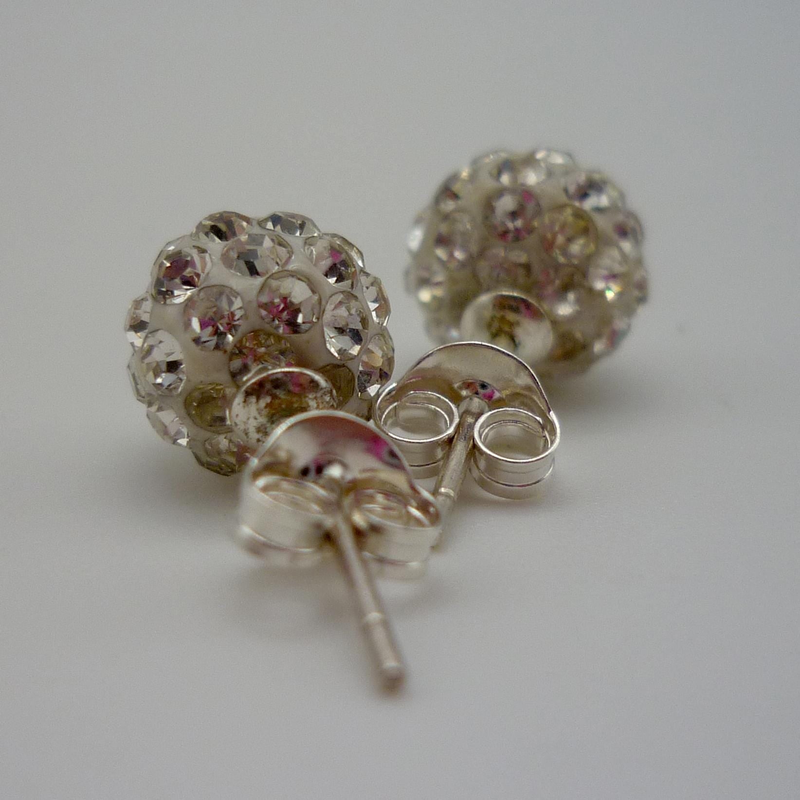 A very pretty and sparkly vintage pair of ball studs, approx. 8mm, with white background studded with small clear rhinestones.