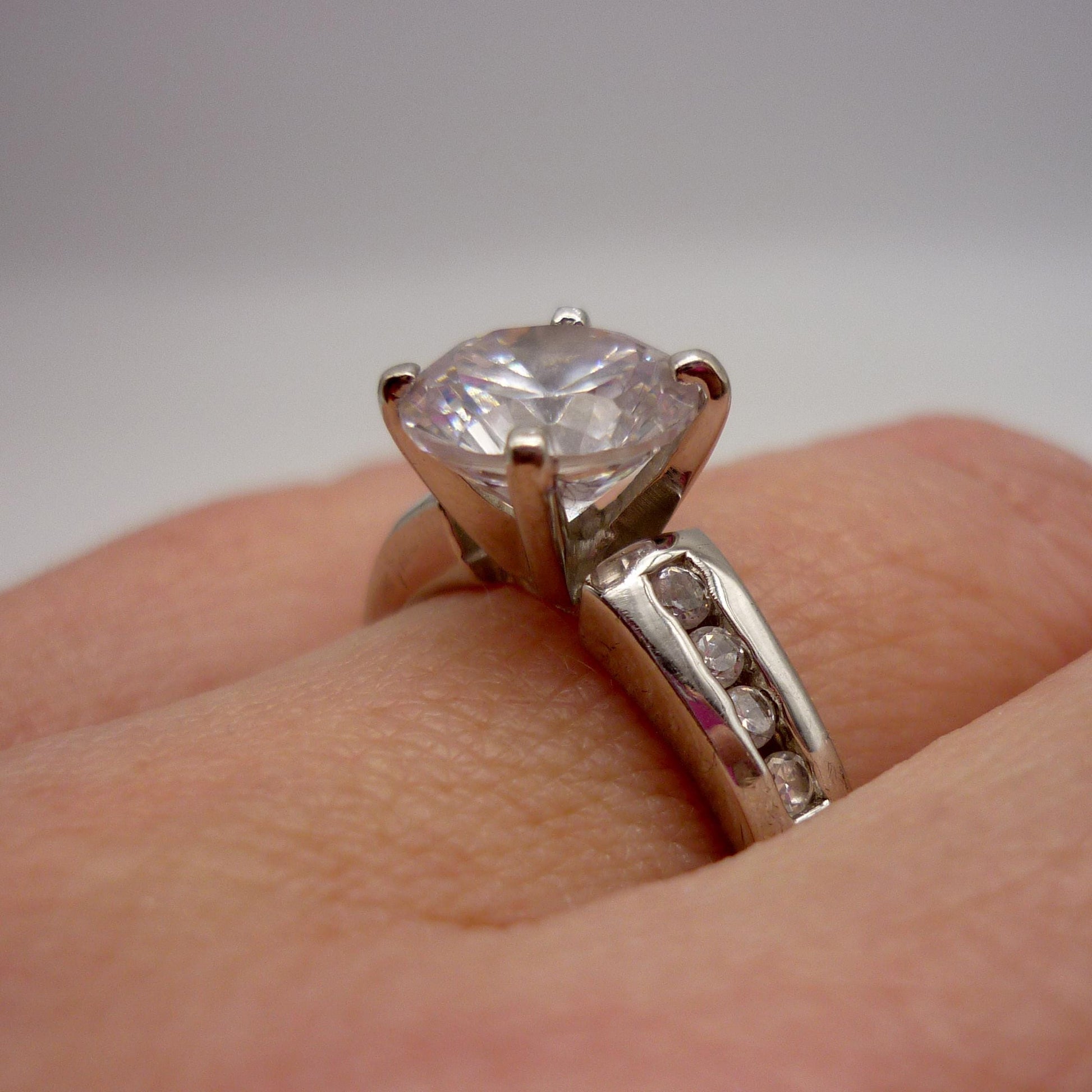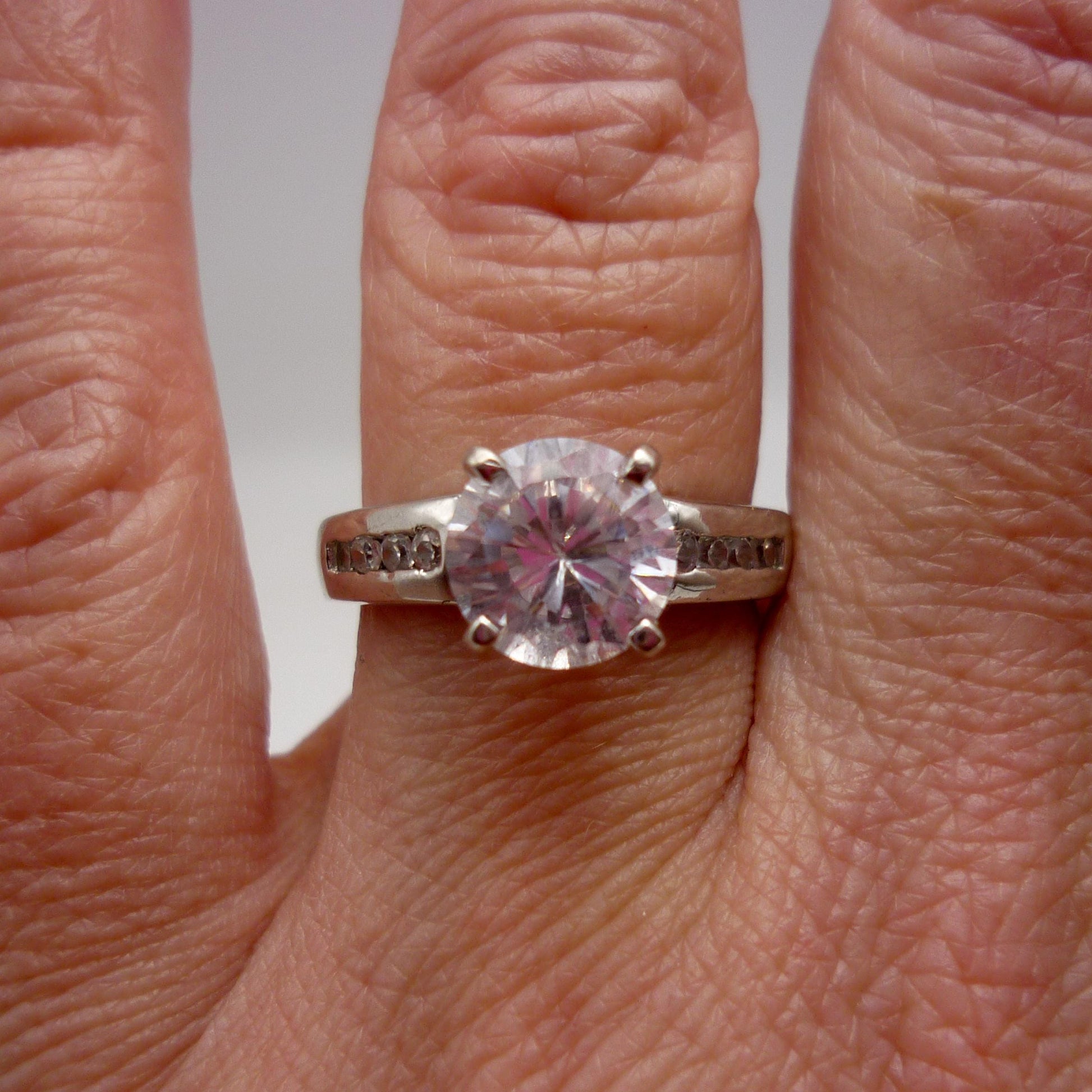 Vintage silver ring set with a large central Cubic Zirconia (approx. 8mm) with 4 small CZ channel set to each shoulder.