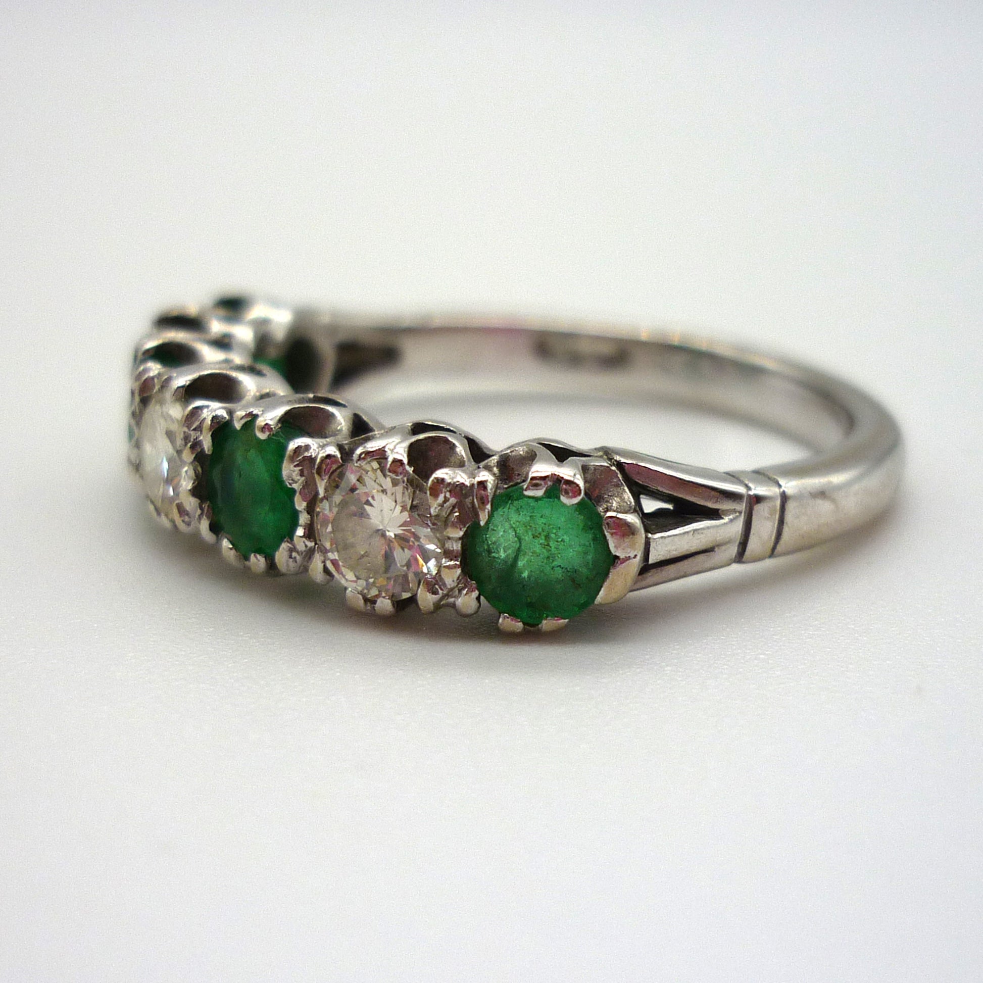 Vintage white gold emerald and diamond seven stone ring. The 3 brilliant cut diamonds are beautifully clear white and sparkling, with a total weight of approx. 0.6ct and we estimate their colour to be I/J and the clarity VS2. The 4 emeralds (approx. 3.5mm diameter) are a fabulous bright green and have the expected flaws consistent with natural stones, including a shallow surface crack to one of the outer gems.