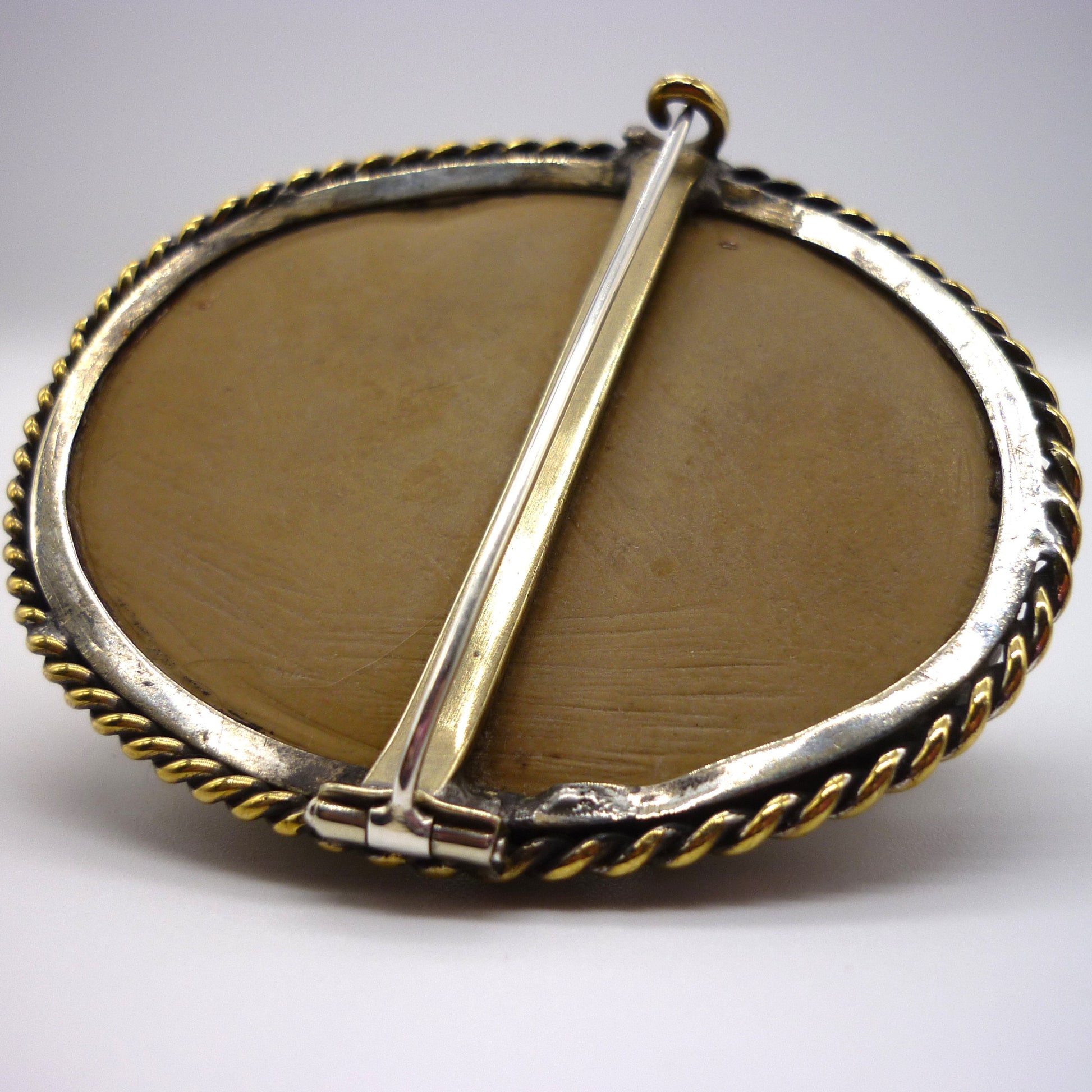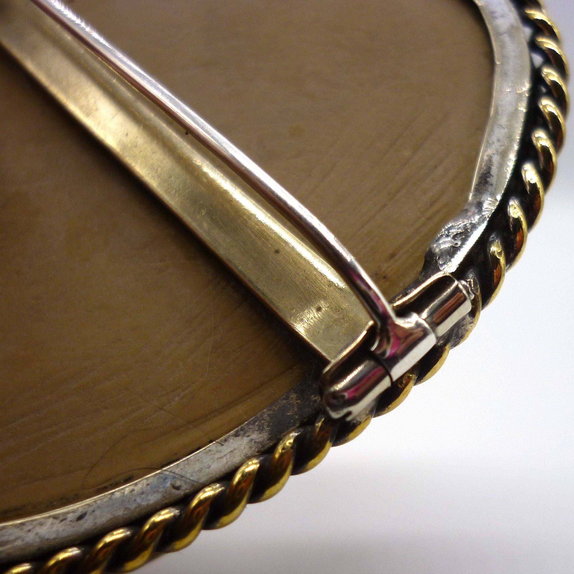 An Edwardian volcanic stone bas relief cameo set in plated guilloche mount, height 5.7cm.