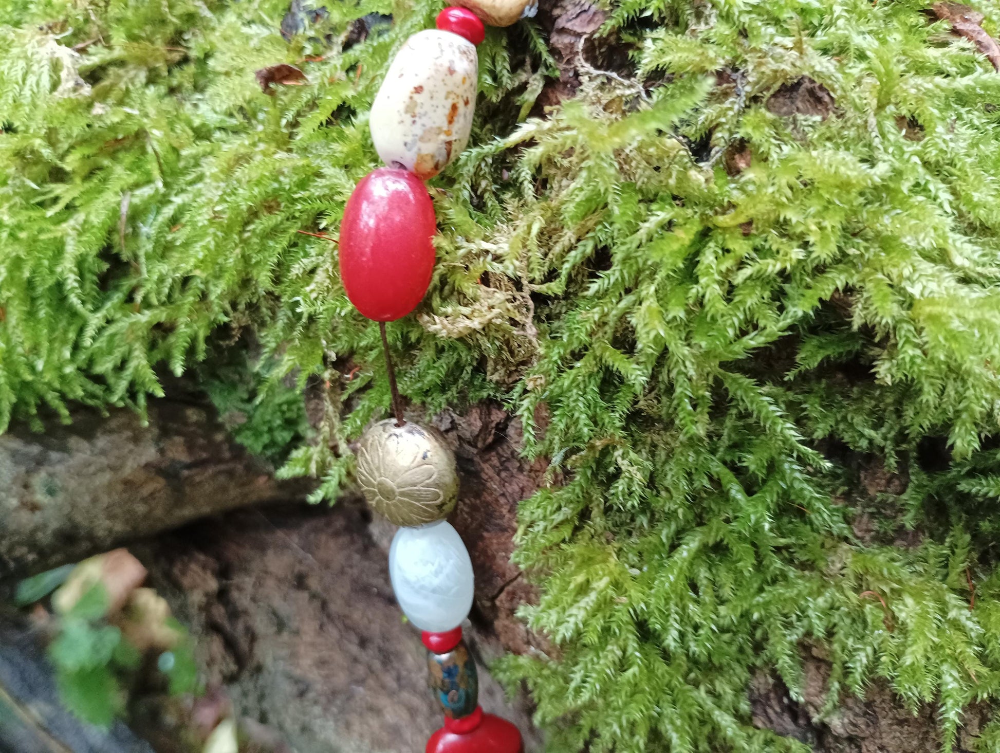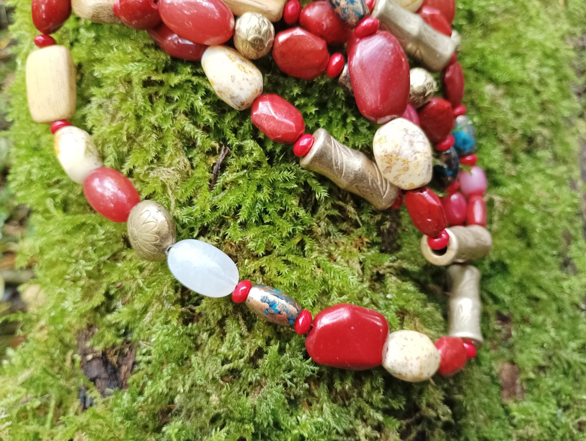 Long Beaded Necklace: Autumn Red, Brown, Gold, Wood & Glass