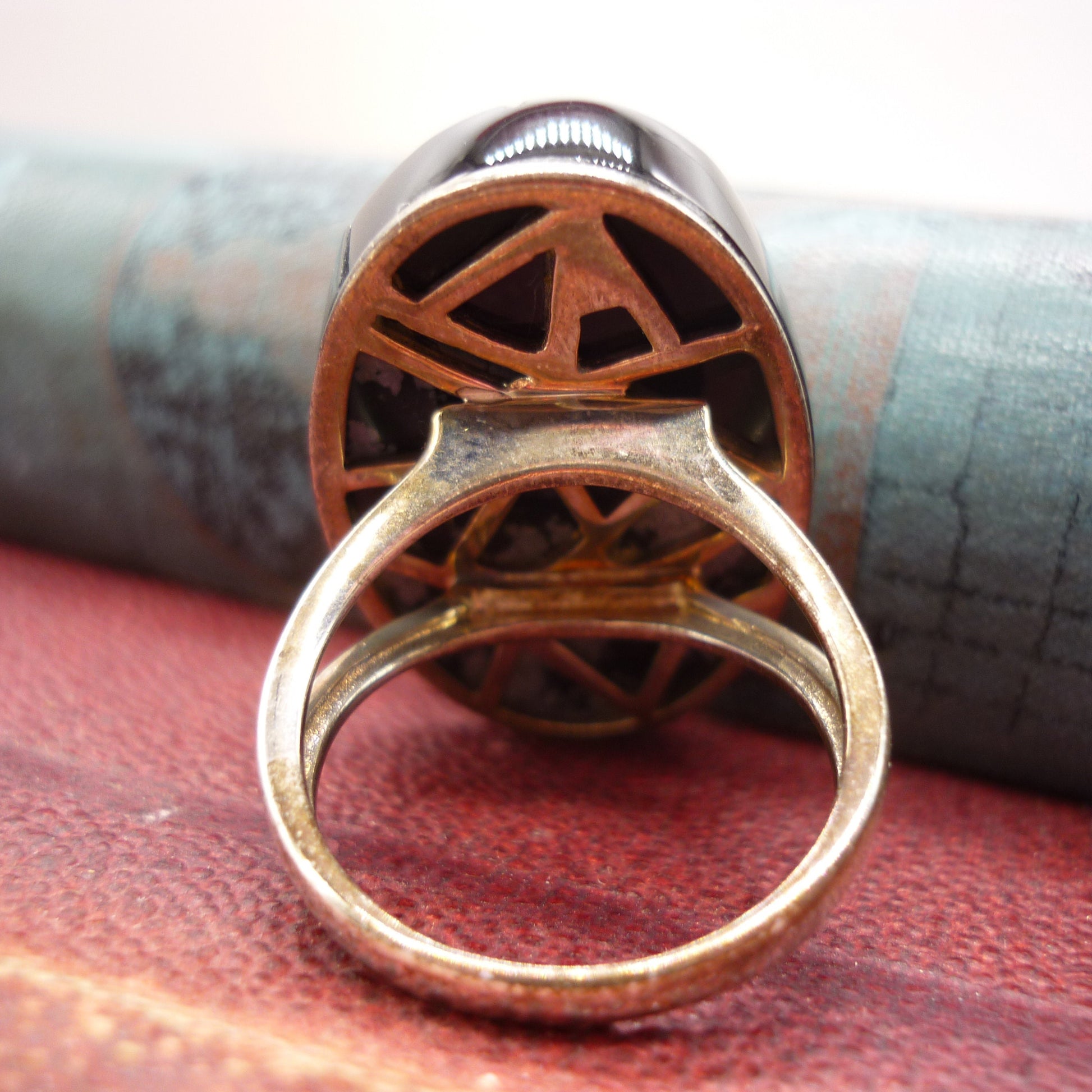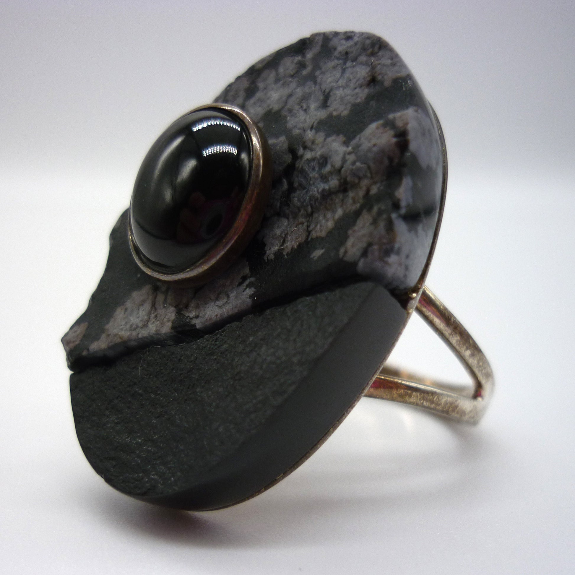 A very unusual oversized jasper ring. The main body of the ring is made from 2 separate pieces of jasper, a larger piece of snowflake jasper and a smaller piece of black jasper. They sit together but do not meet snugly, there is a small gap between them. The top of both stones has been left raw, with the natural uneven surface including some chips to to the girdle left in place. The edges have been polished. The face of the ring measures approx 3cm North to South. To the snowflake section is a polished oval cabochon of black jasper, approx. 1cm in length, set in patinaed silver. The reverse of the ring is an ornate geometrical design in silver, set upon a split silver shank. The silver has darkened and has patches of patina patches.