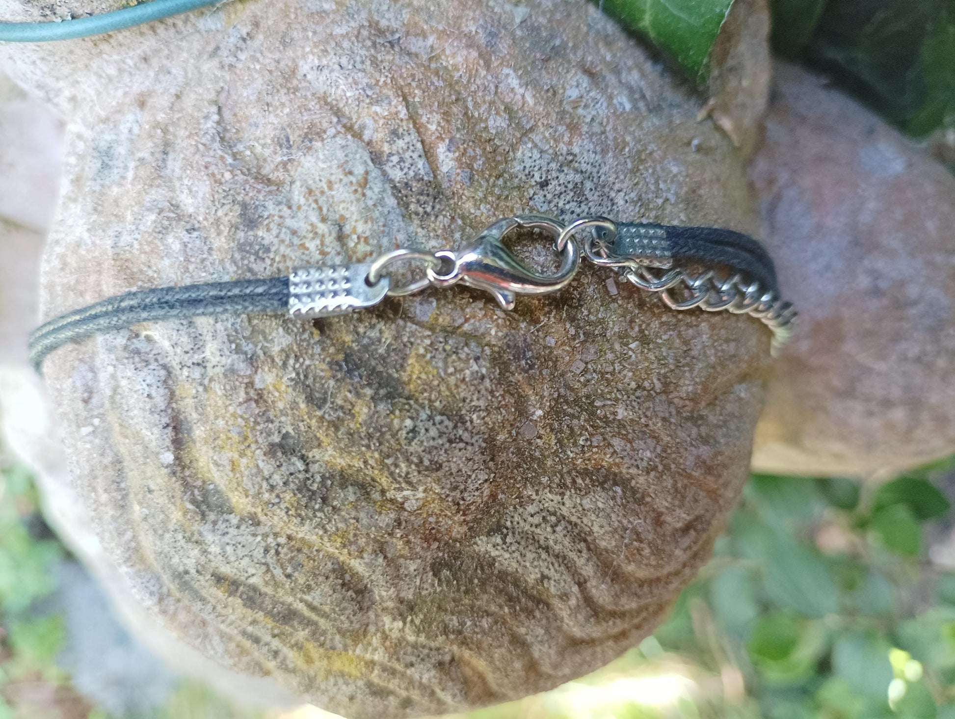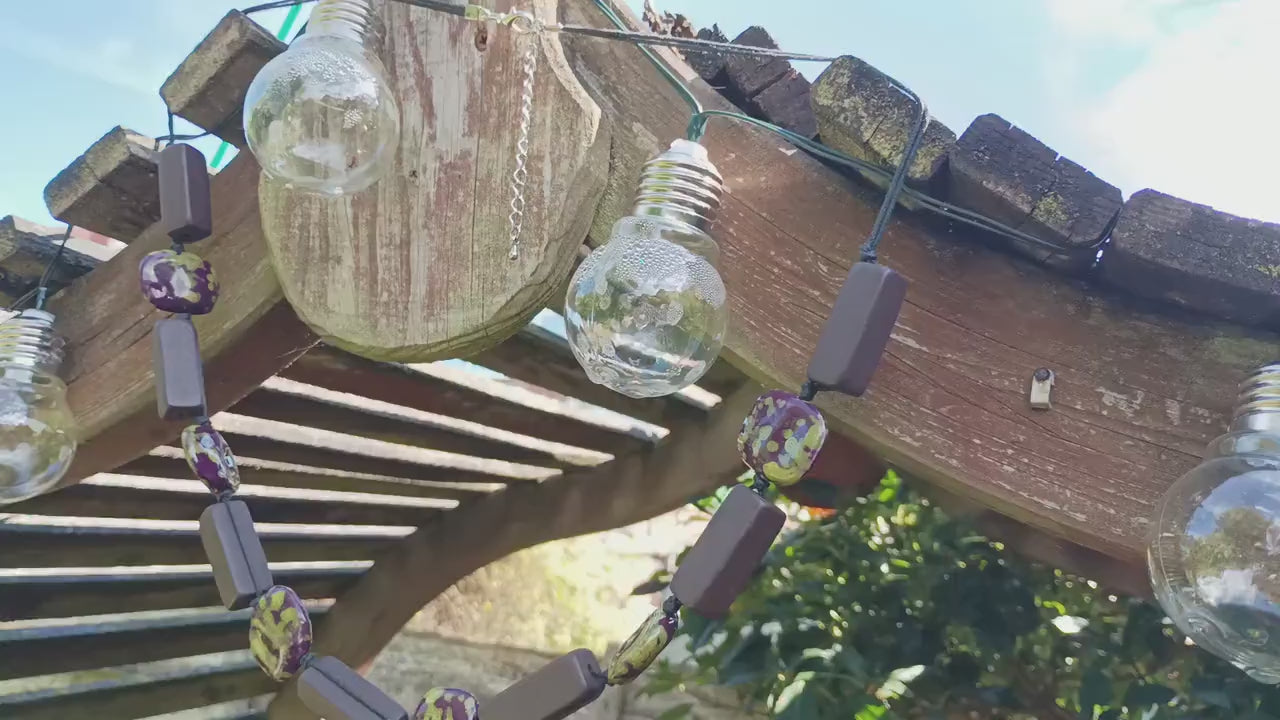 Vintage brown, green and purple ceramic beaded cord necklace. The necklace is approximately 33 inches long (adjustable to 36 inches).