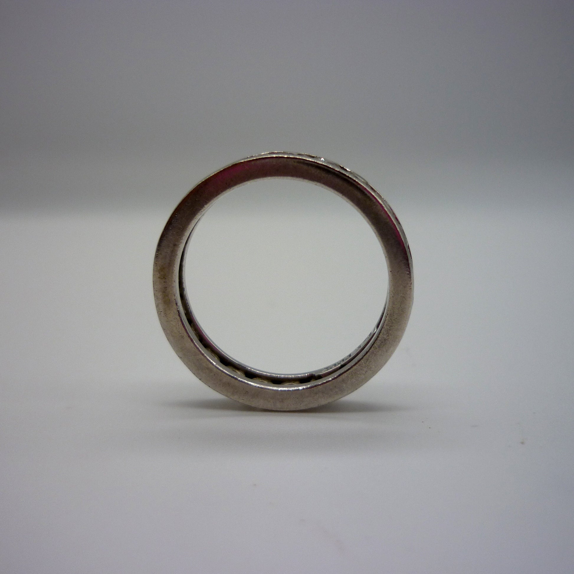 Vintage silver stacking ring channel set with round simulated diamonds.