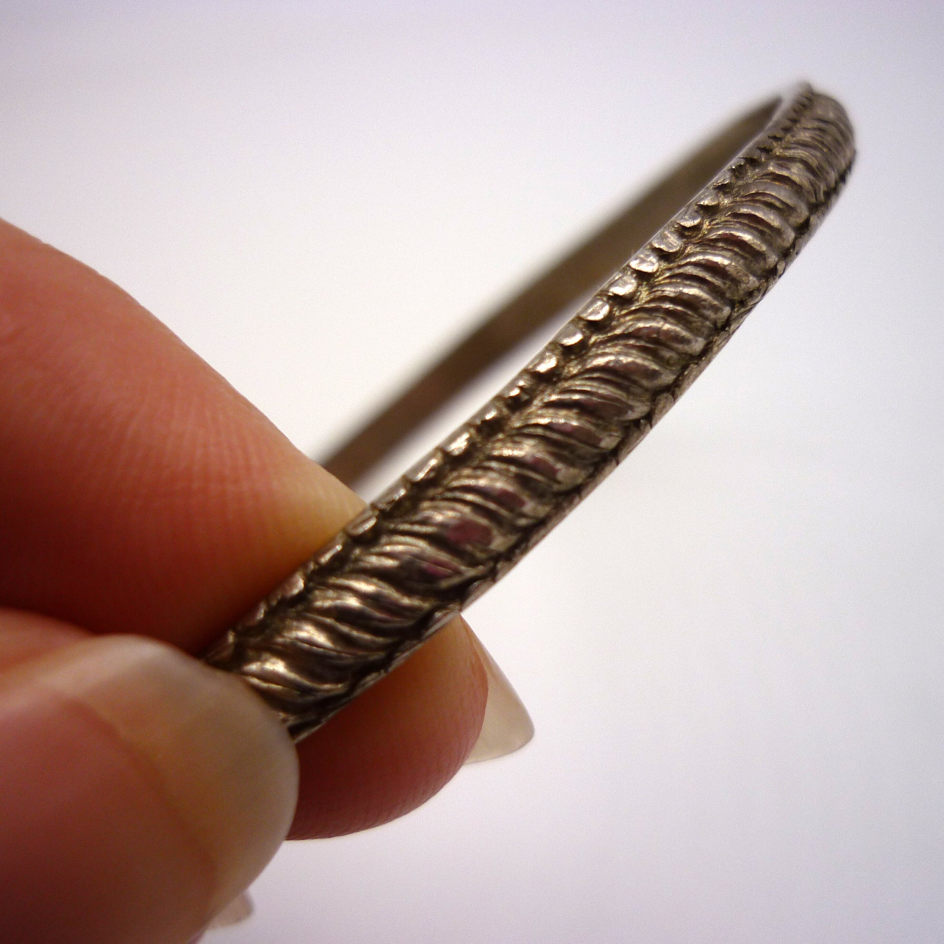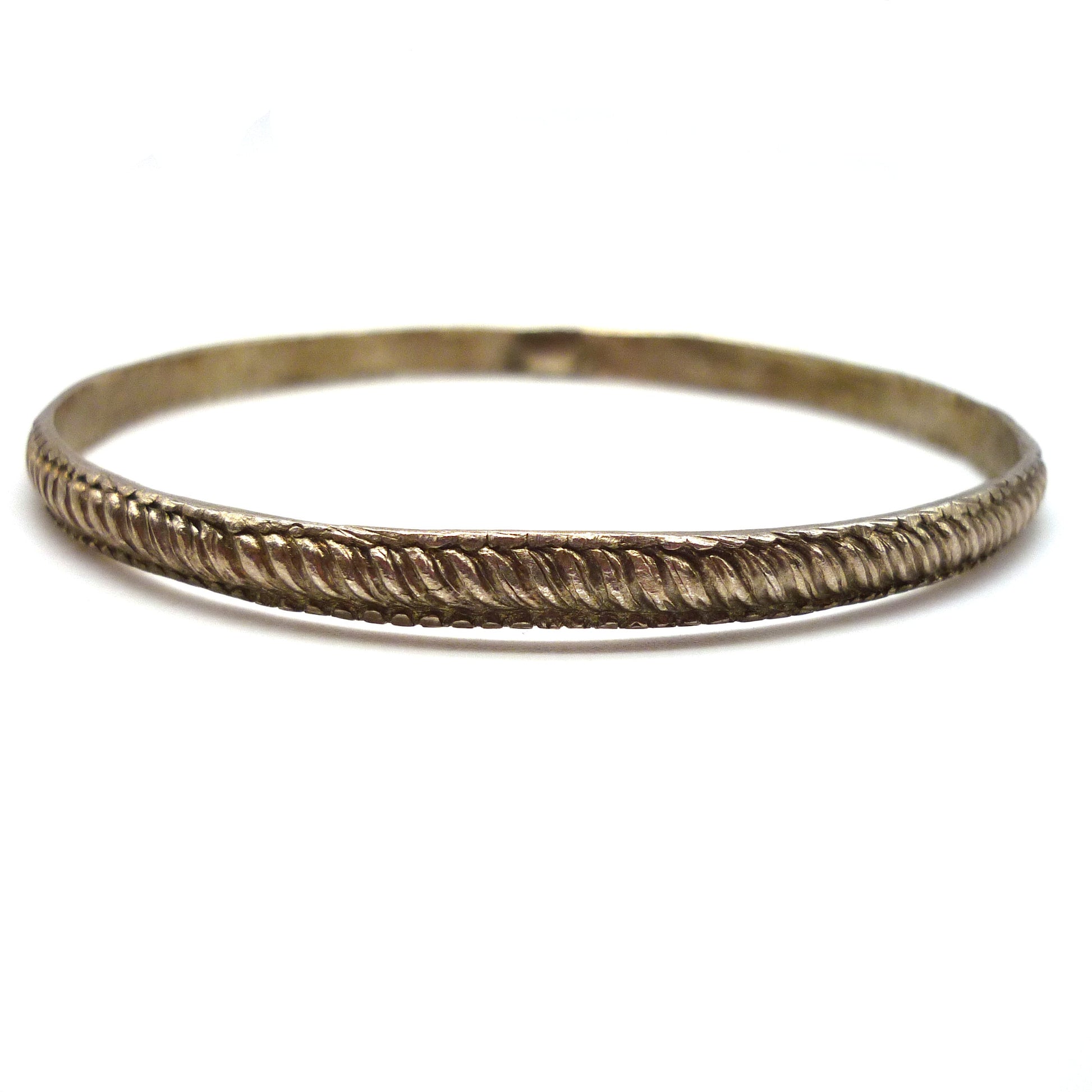 Early 20th century thin silver stacking bracelet with textured pattern.