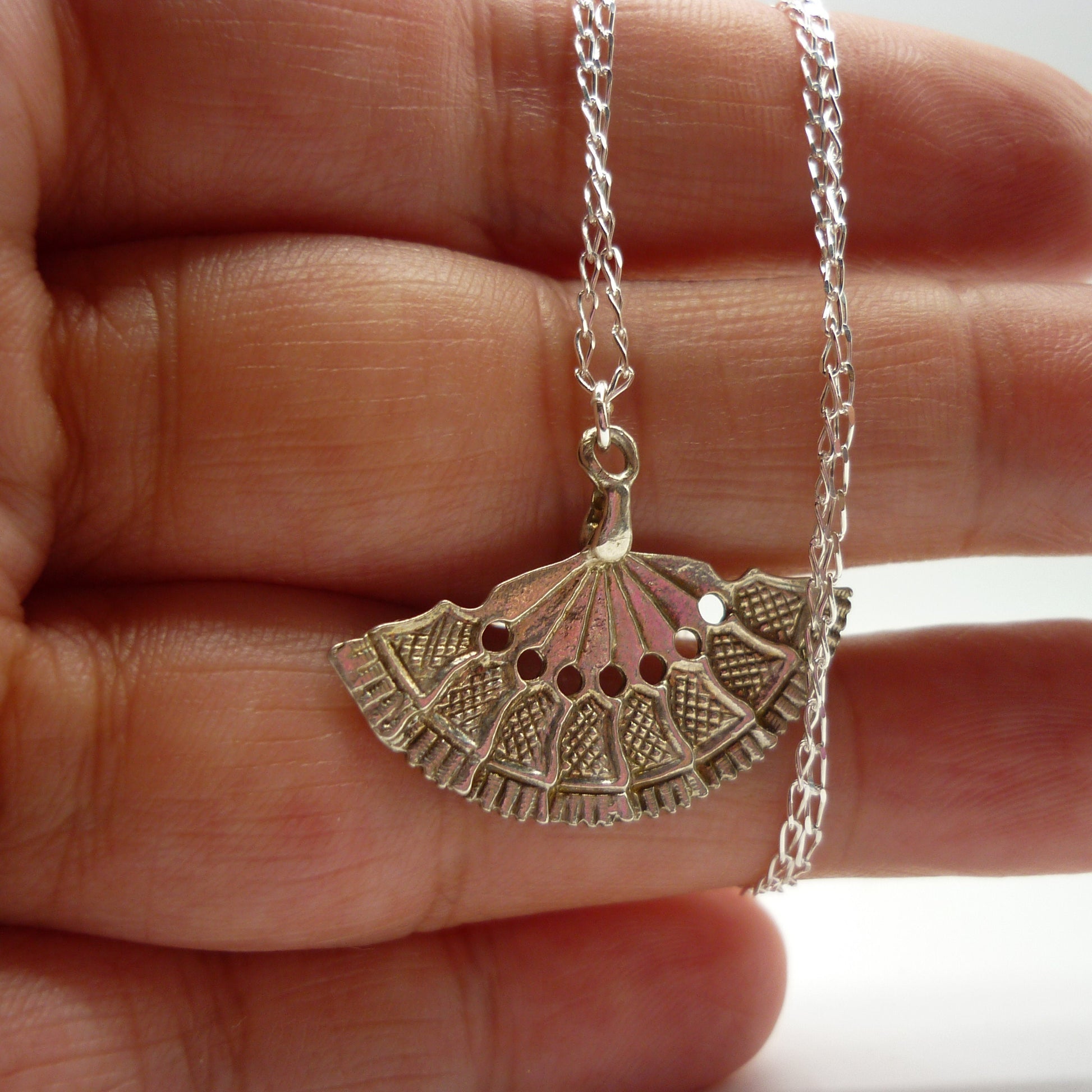 A sweet little vintage charm necklace featuring a silver fan charm. The 1970's silver charm measures approx. 1 inch wide and is stamped 900 for silver. It is in very good condition with light surface wear