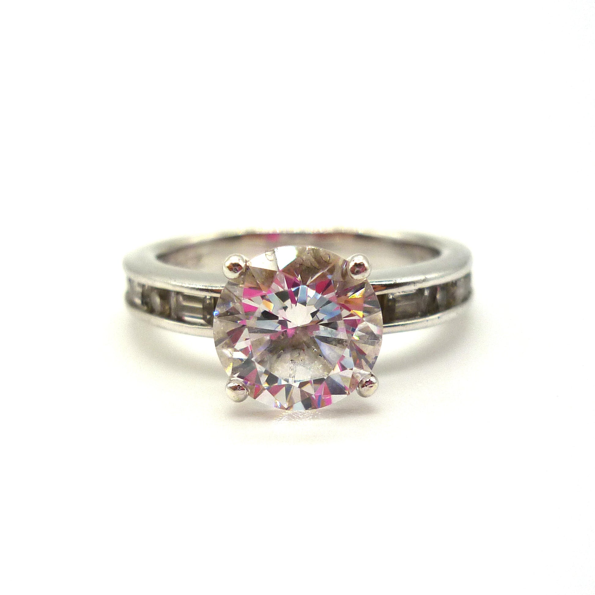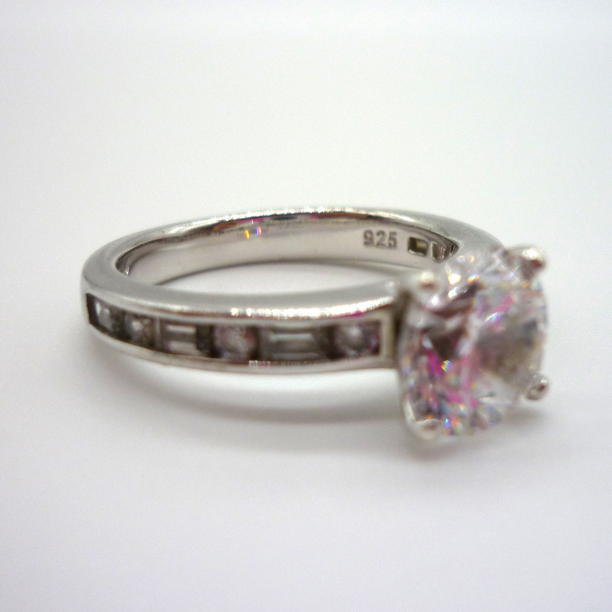 Large (approx 8mm) prong set simulated diamond solitaire set upon a chunky sterling silver band, channel set with alternating round and baguette cut CZ.