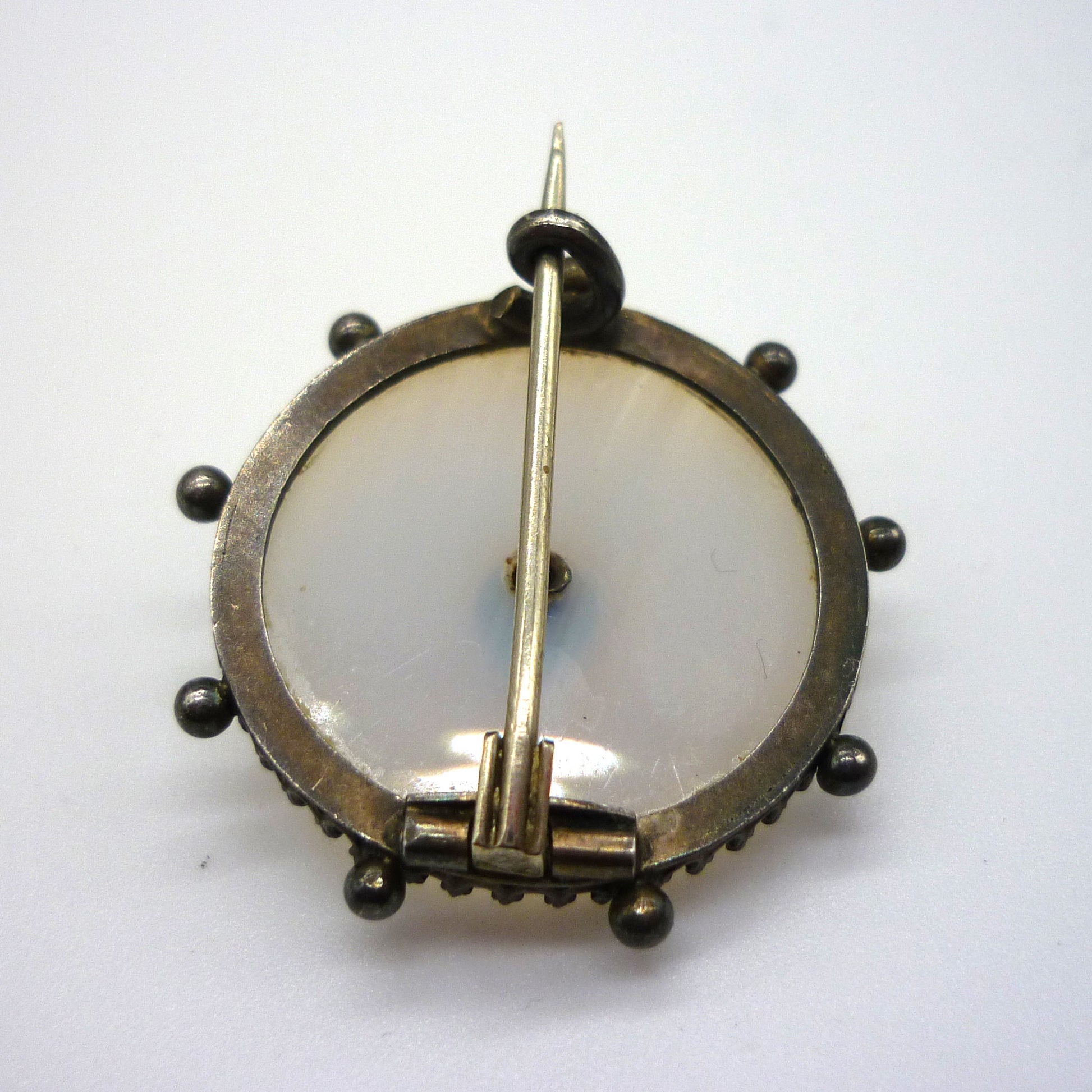 A sweet little Victorian chalcendony brooch. Set in silver toned metal, the white stone shows subtle striped patterning when held to the light. In very good condition with light surface wear. Approx 2.7cm across with long pin and c clasp. Your brooch will be sent gift wrapped.