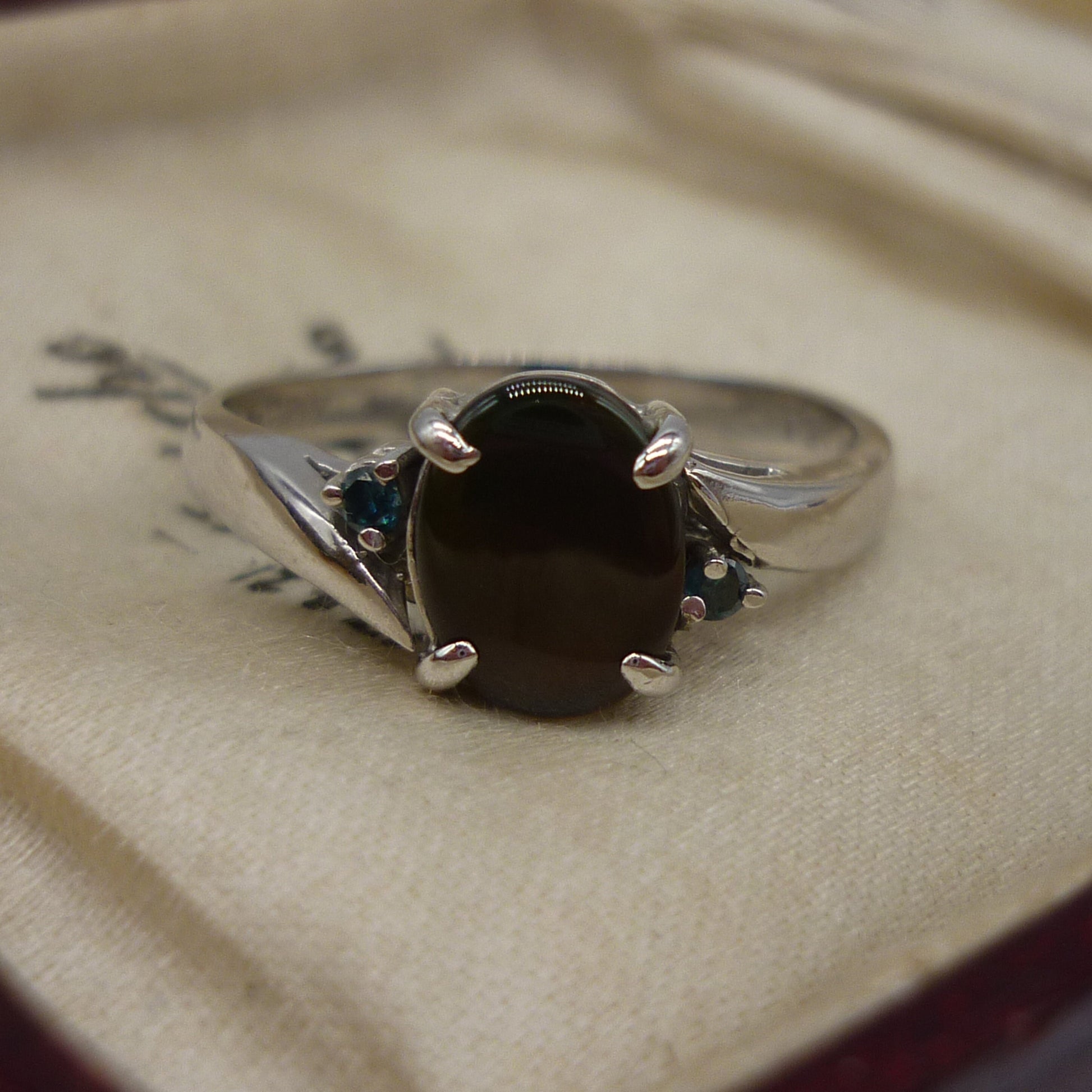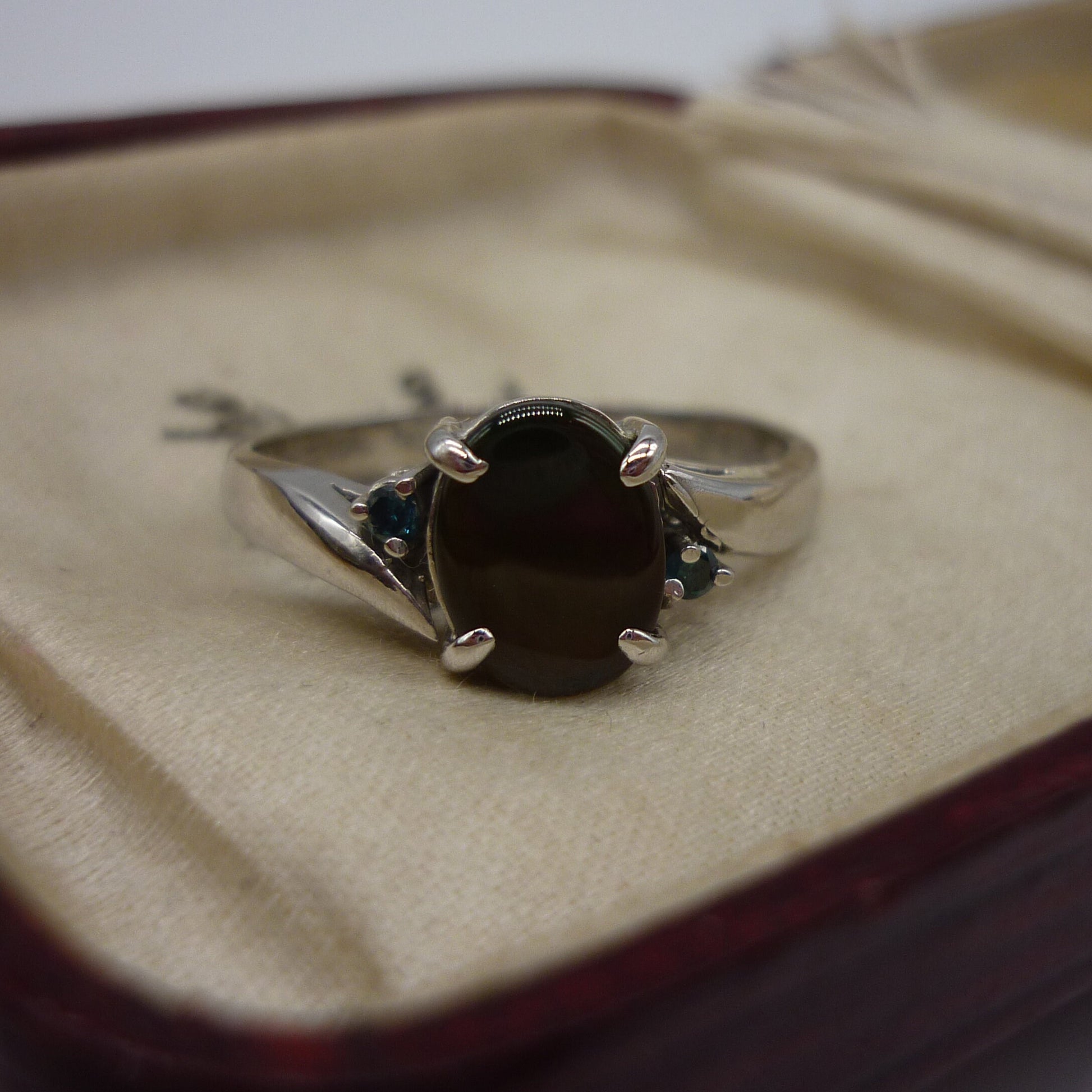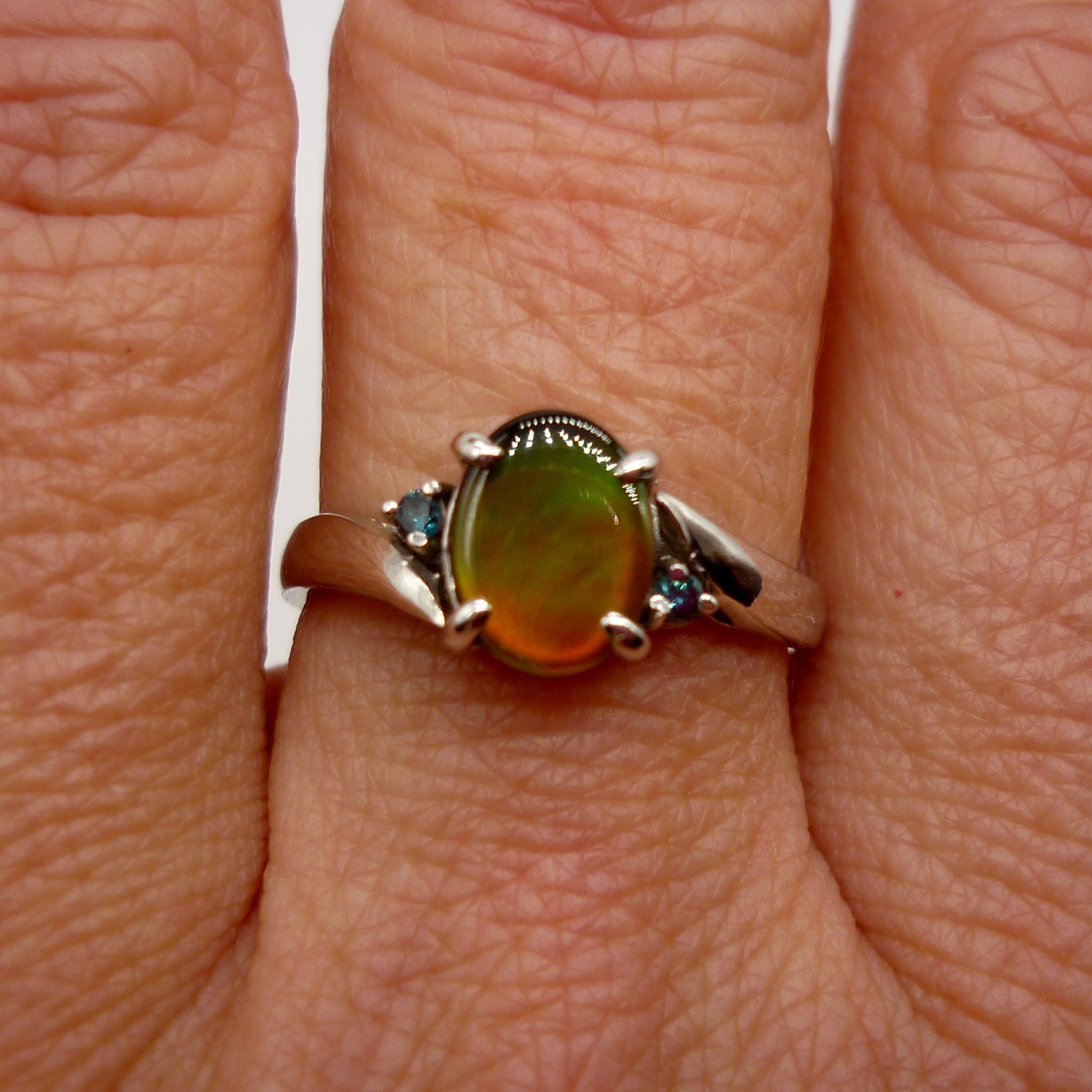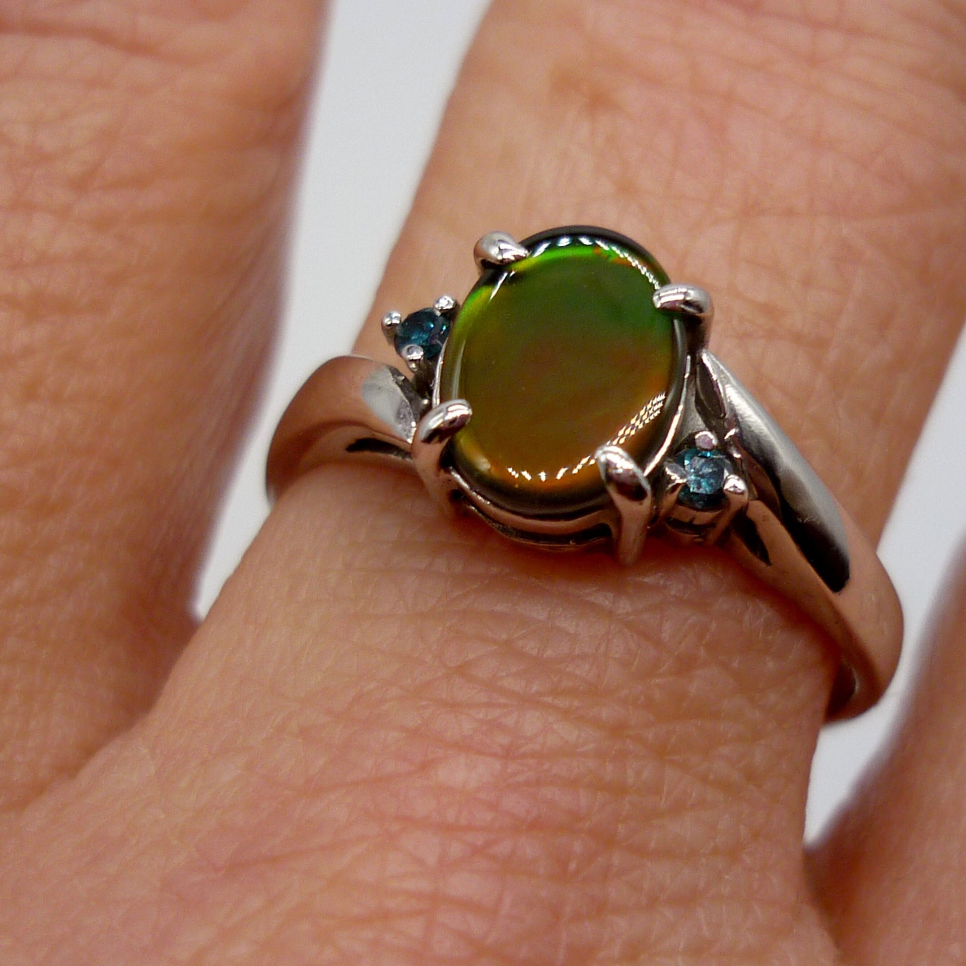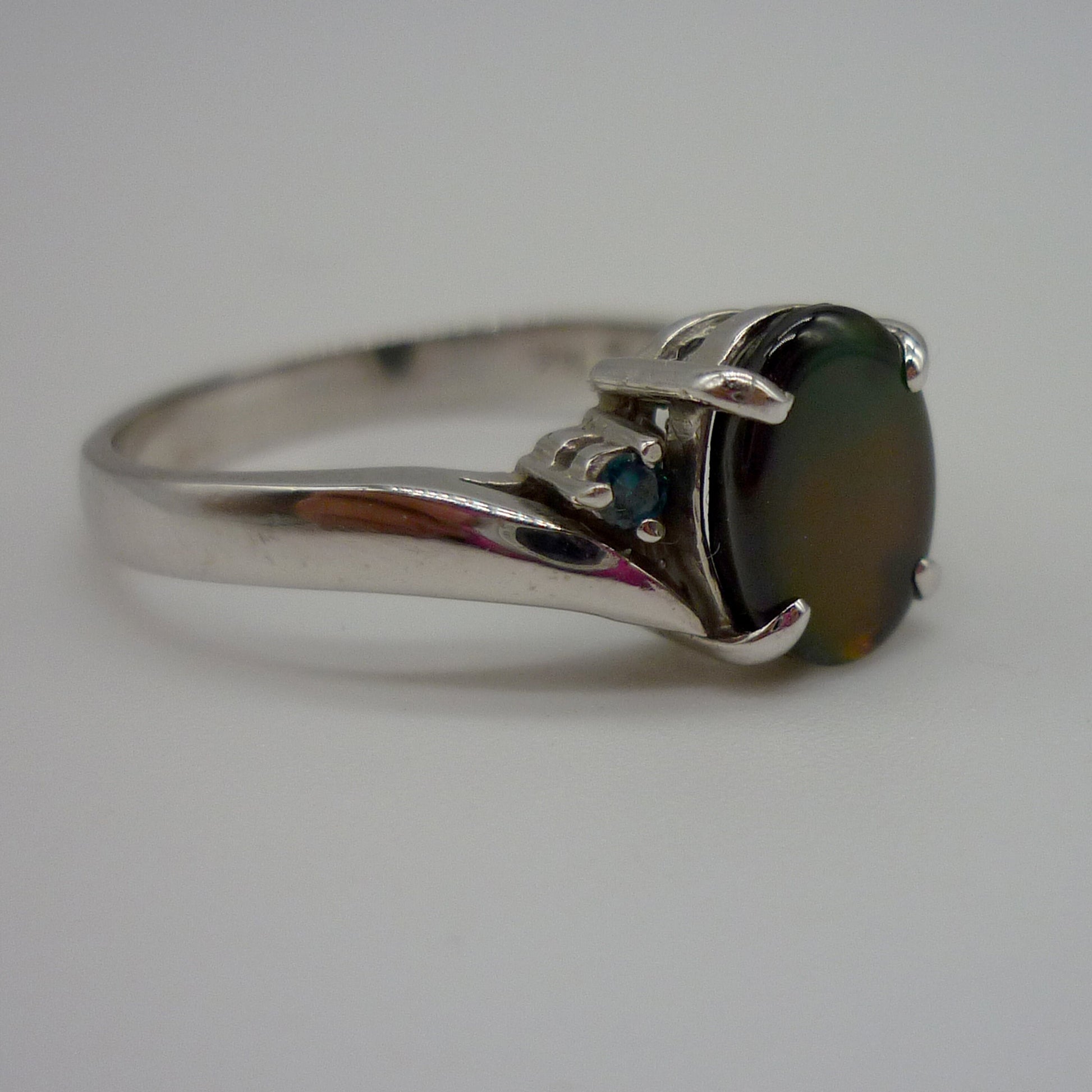 A very pretty 14k white gold ring, set with a central opal triplet nestled between 2 tiny blue gemstones. The opal measures 8mm top to bottom and has lovely shimmers of green and orange/red tones.
