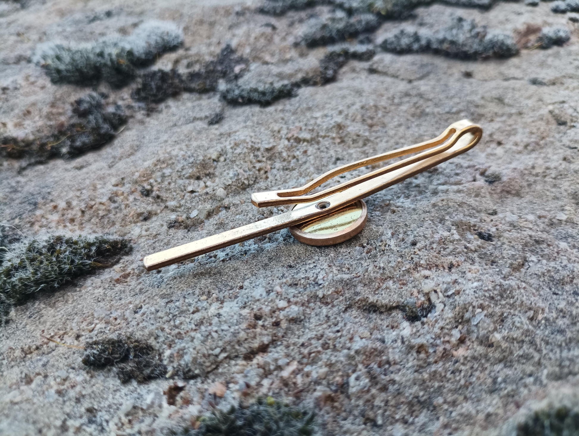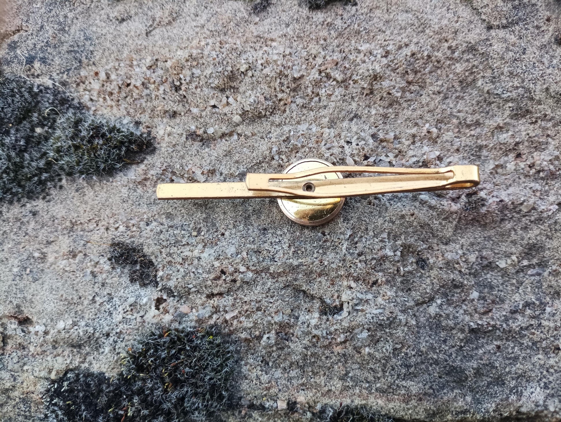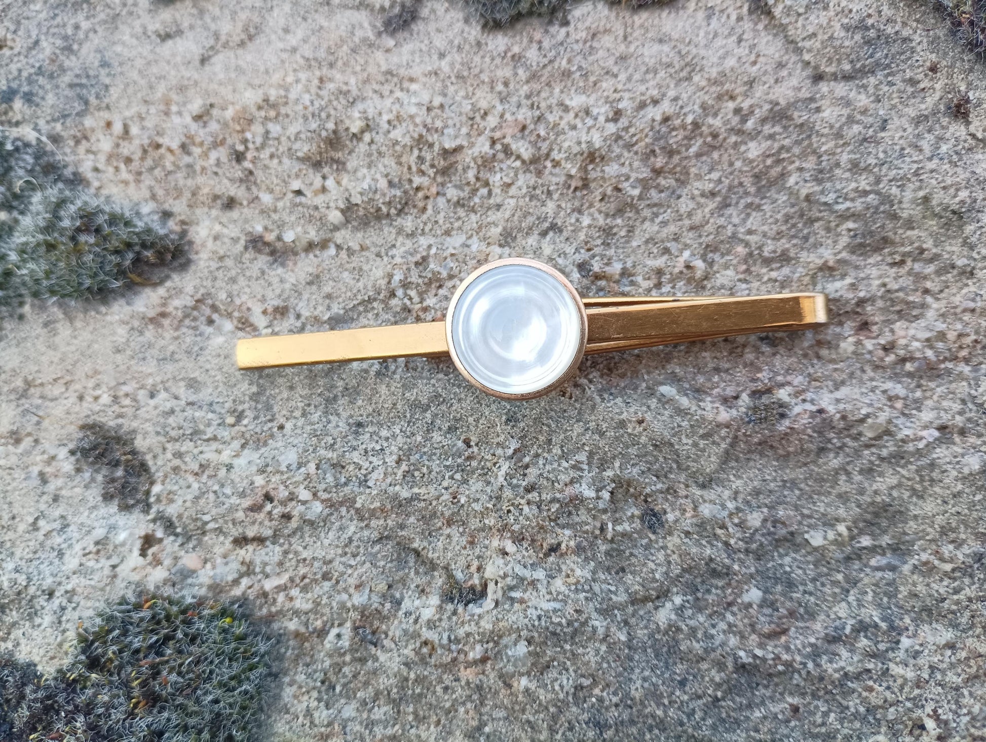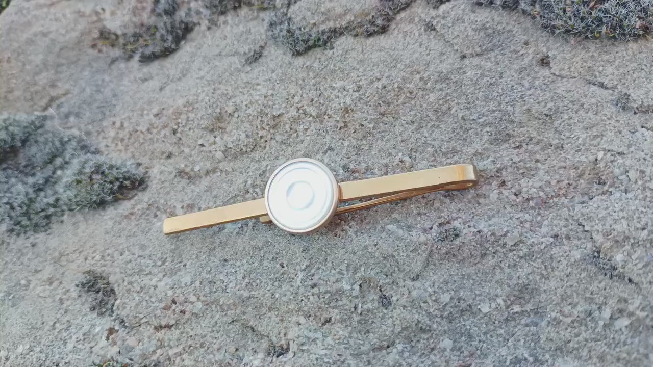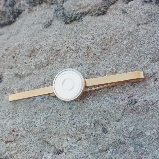 Gold toned metal tie clip with a mother of pearl circular design. Measures approx 2.75 inches. Very good condition with some marks/wear.