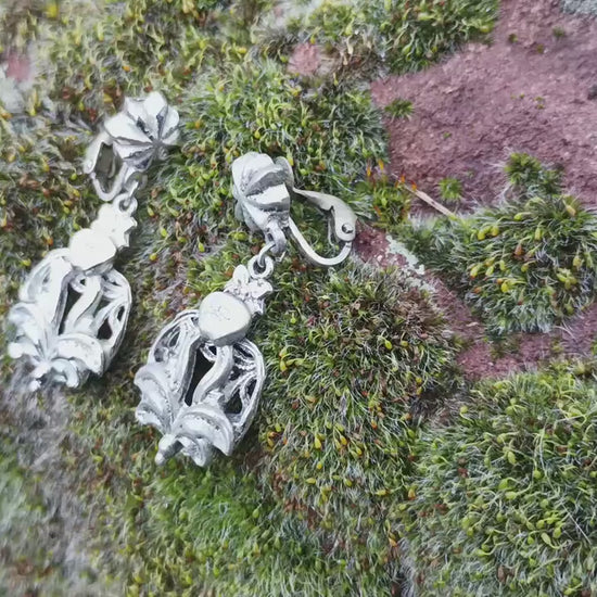 Vintage Art Nouveau Clip On Earrings: Silver Tone Dangle, Botanical Design