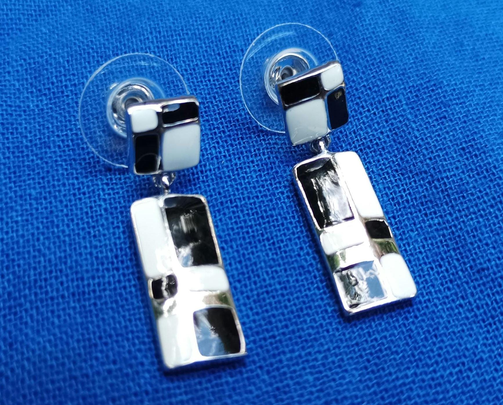 Vintage white and black drop earrings. They are made from a silver tone metal with enamel decoration. The stud posts will be sterilised before dispatch. Brand new silver plated/plastic backs will be included.