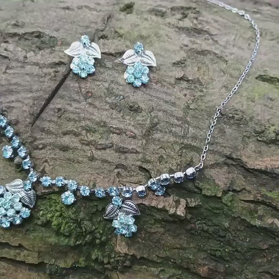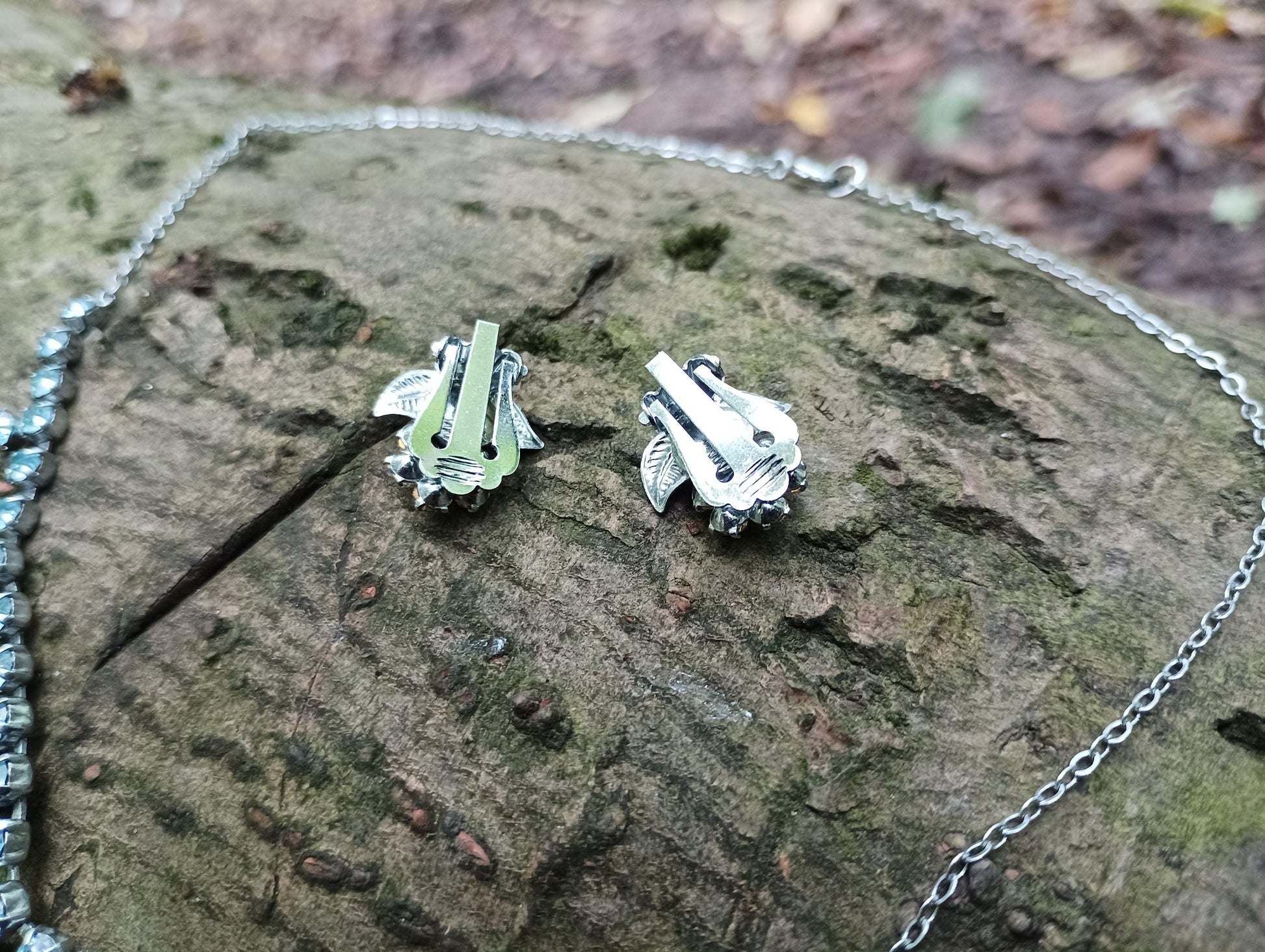 A vintage silver plated matching necklace and clip on earring set, both with a metal leaf pattern set with pale blue rhinestone flower design.