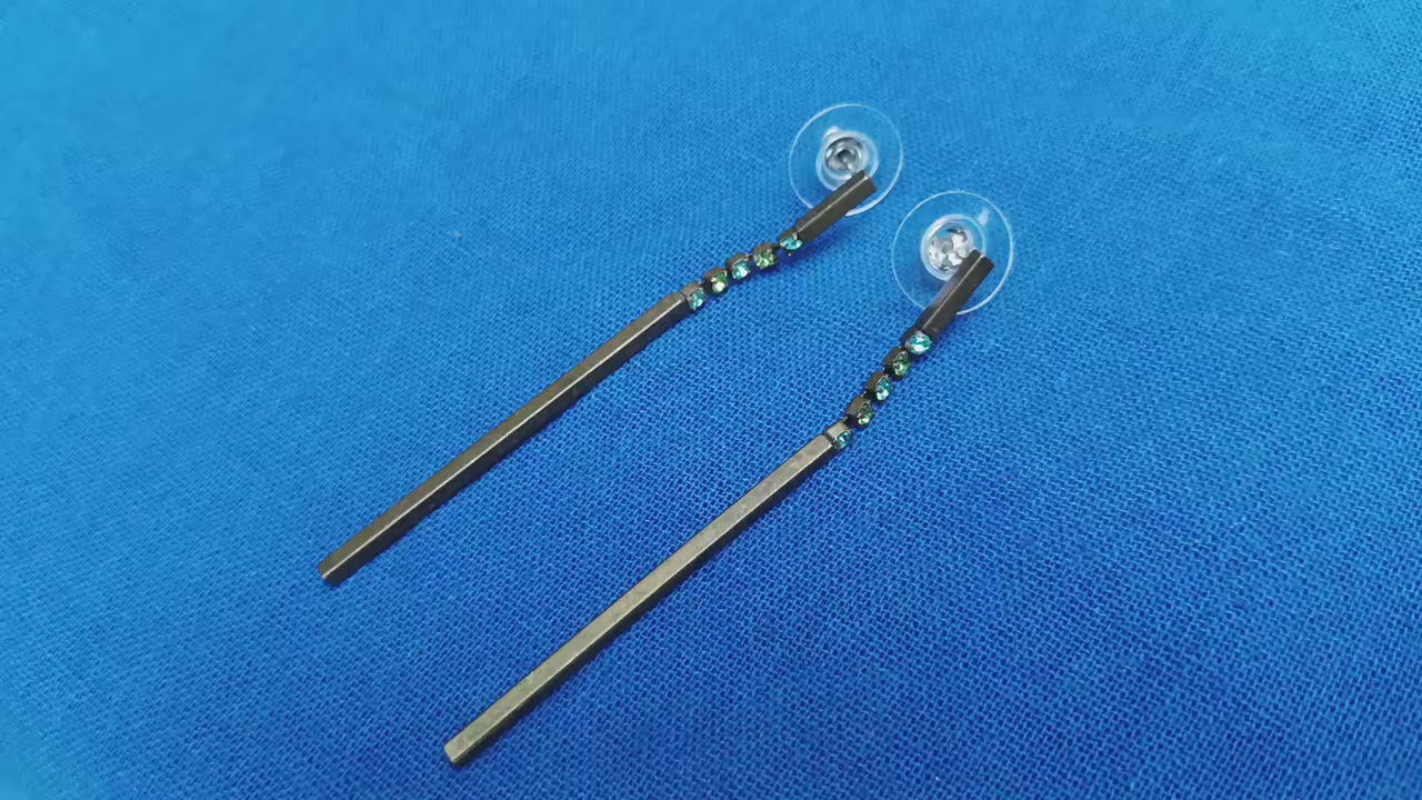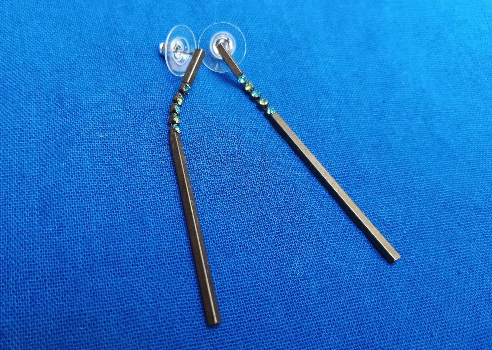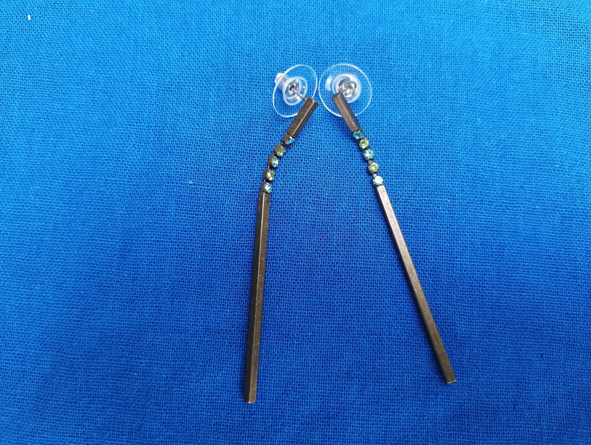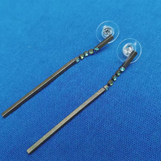A pair of beautifully sparkly vintage bronze tone metal stick and blue and green rhinestone dangle earrings.