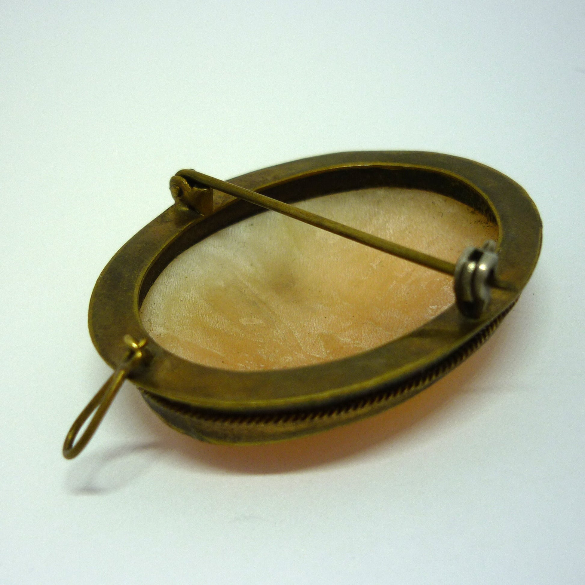 Vintage shell cameo brooch/pendant, in fair condition and with a yellow metal frame. It closes securely with a rollover clasp. There is some patina and wear to the frame and discolouration to the cameo.