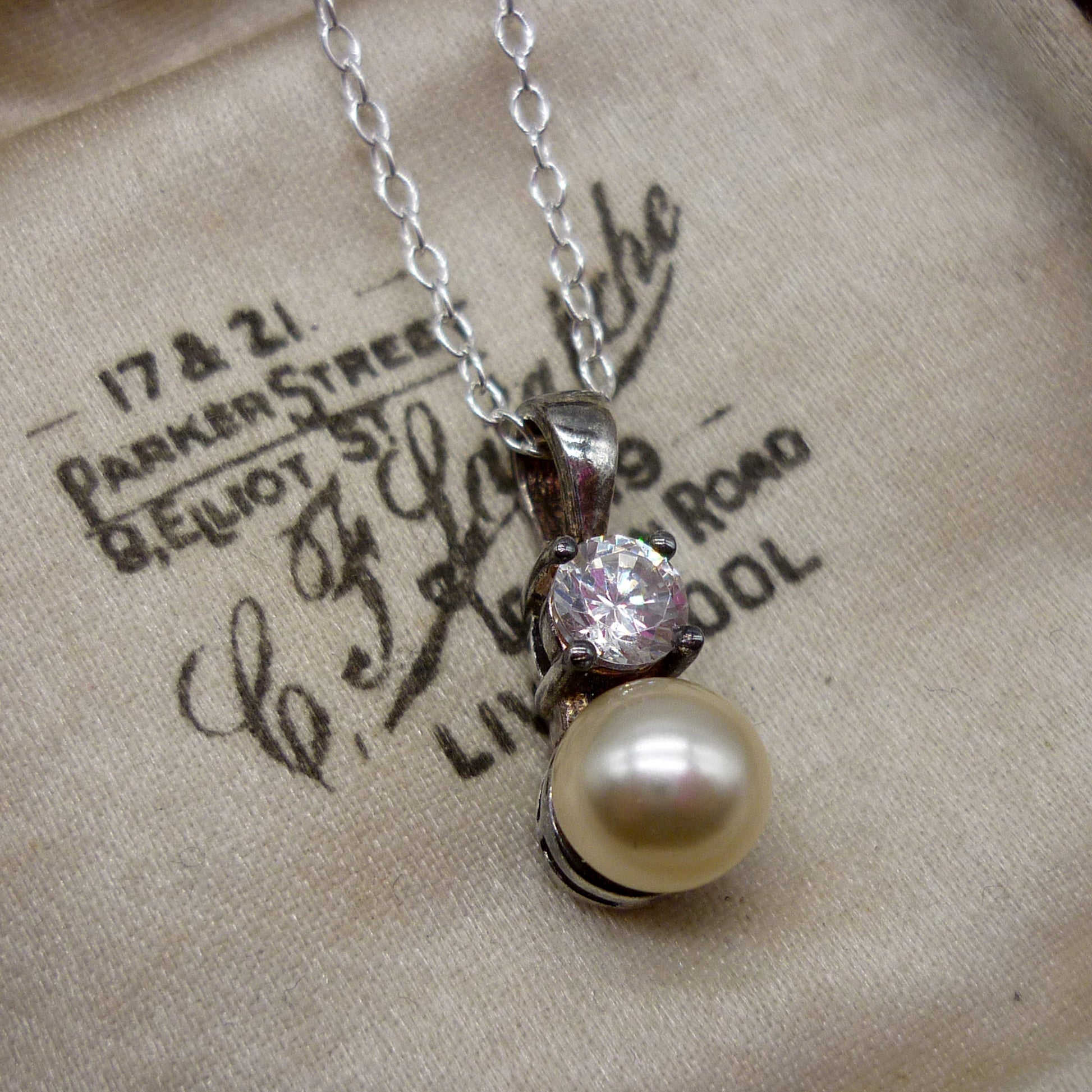 Vintage Costume Pearl and Diamond Pendant on a Sterling Silver Chain