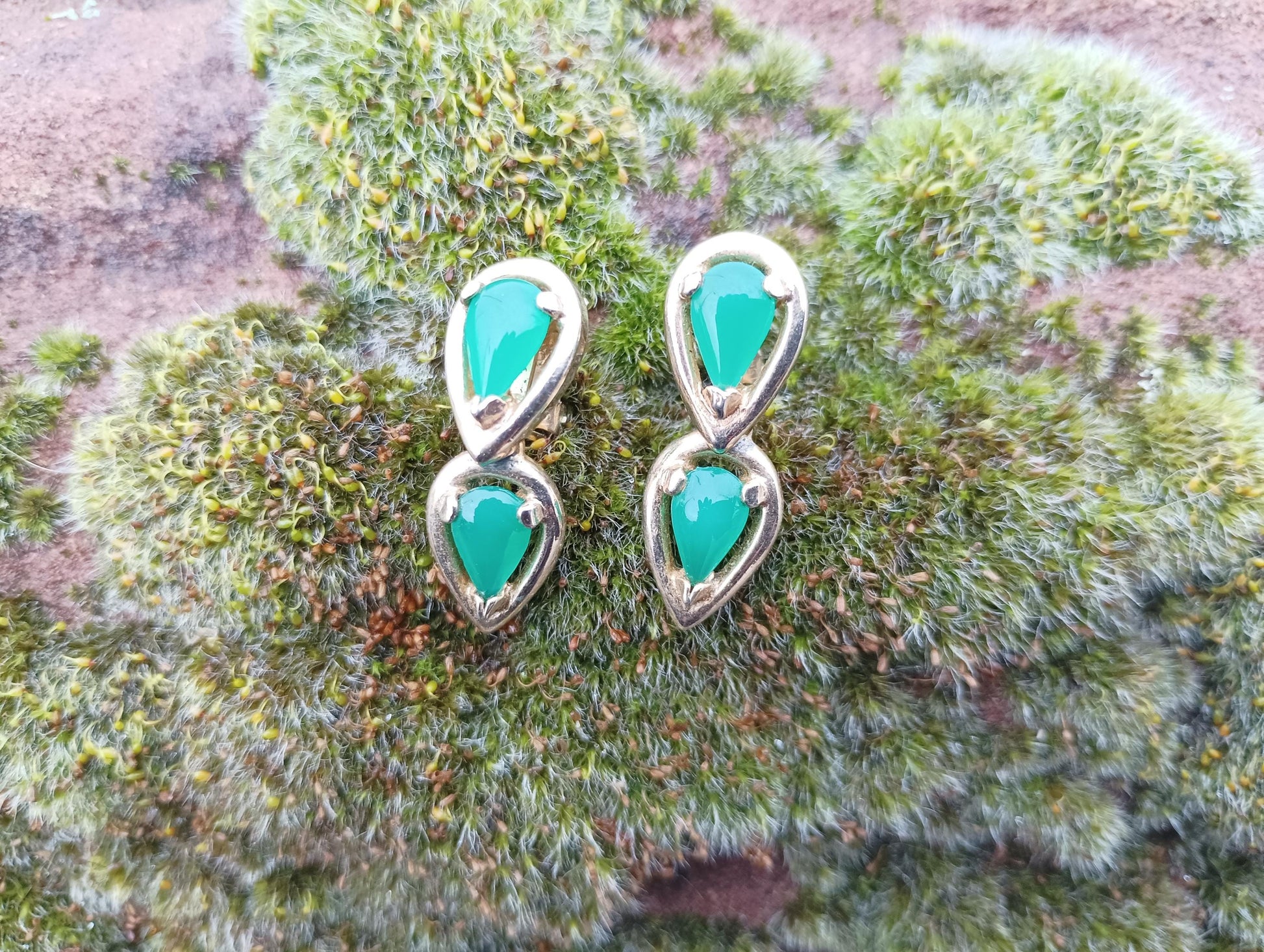 Vintage Gold Plated Jade Clip On Earrings: 1960s Emerald Green Dangle