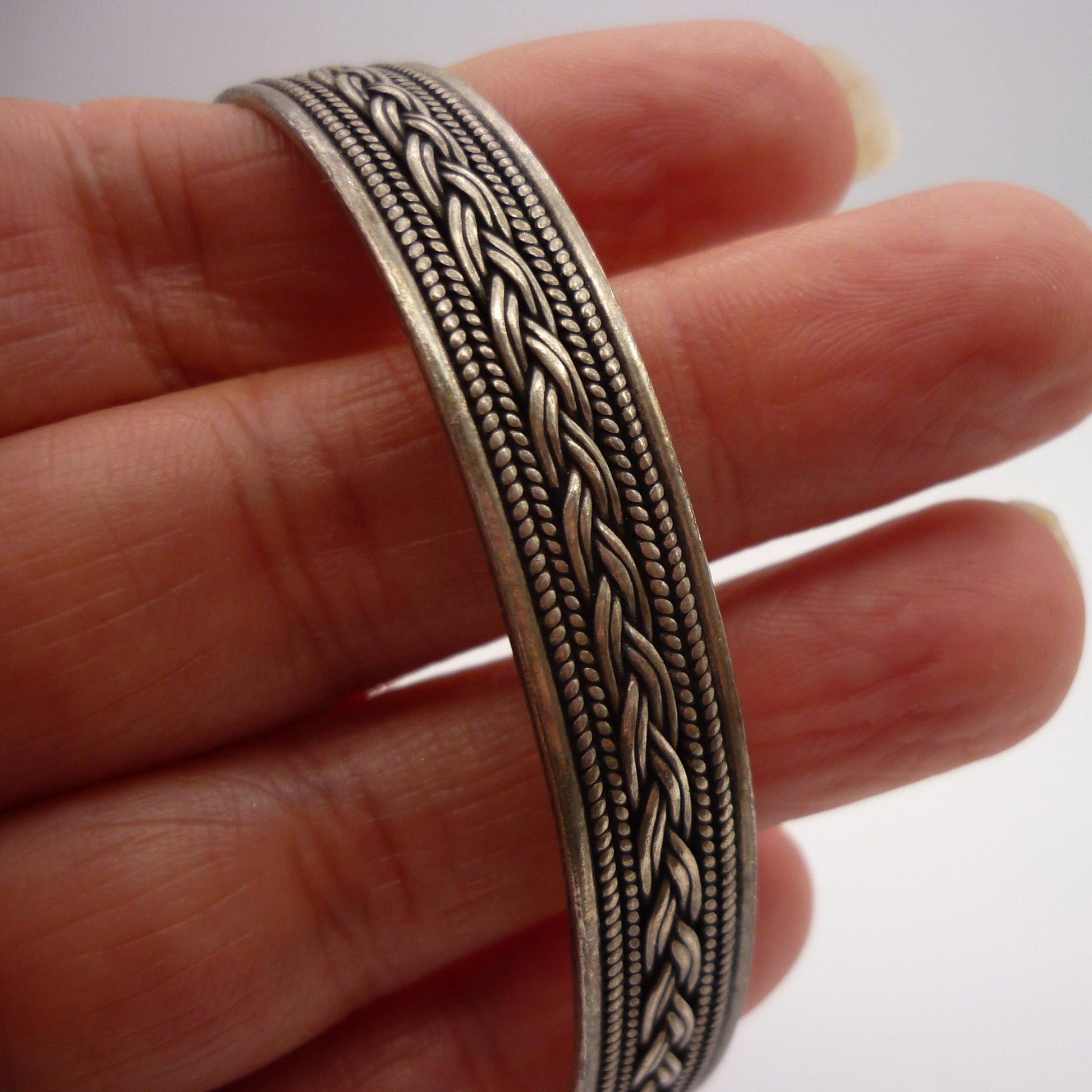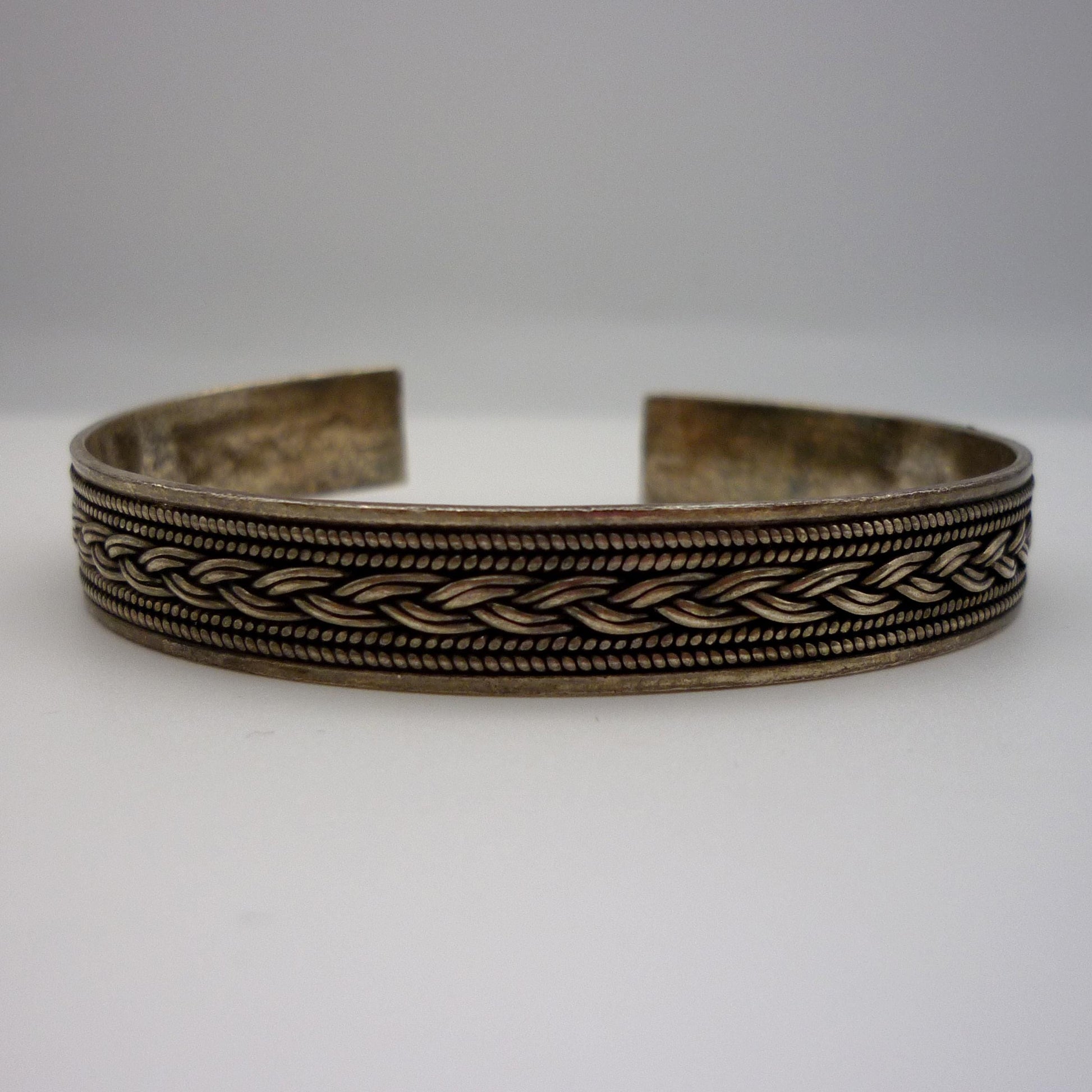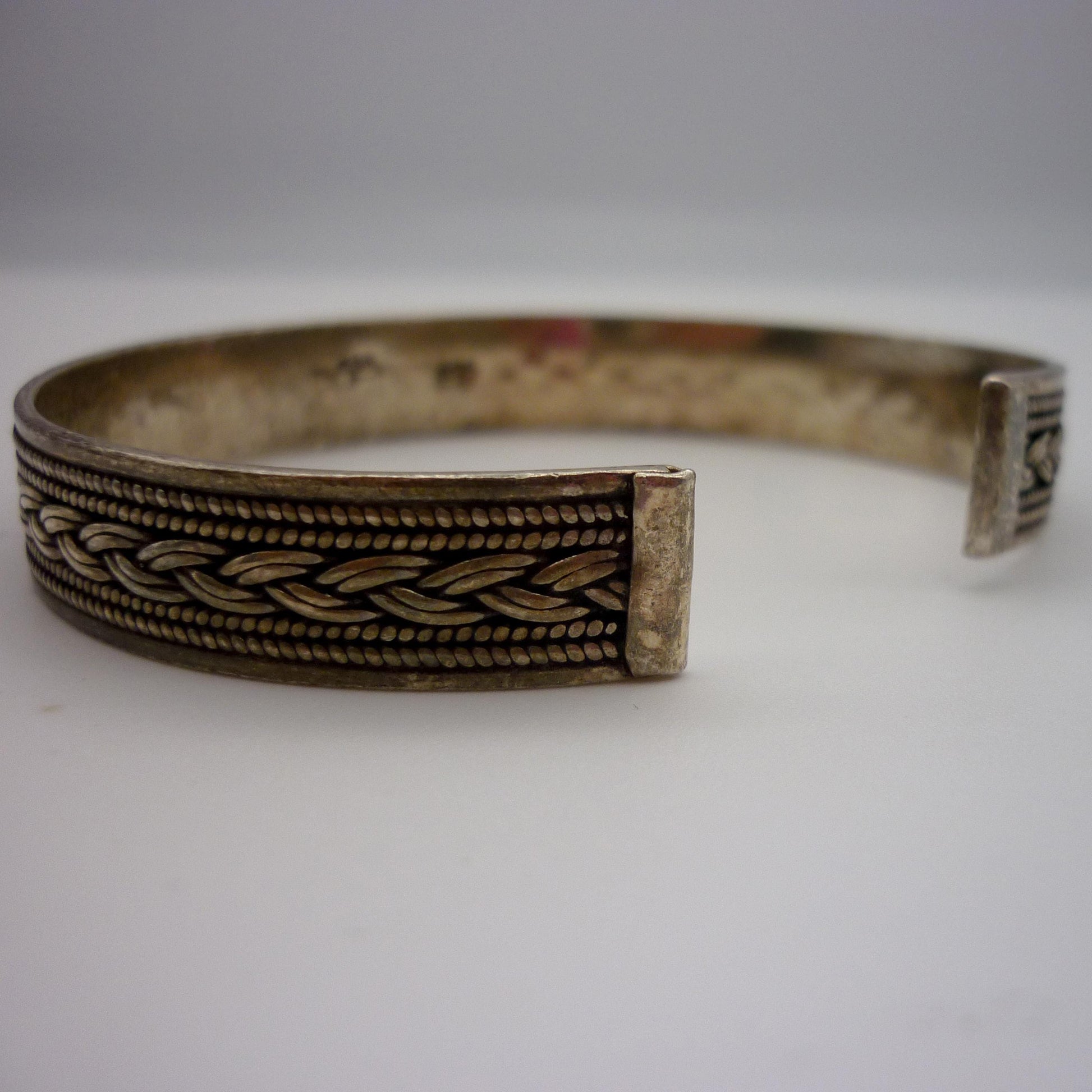 Vintage sterling silver Navajo style bangle with intertwined knotted rope pattern.