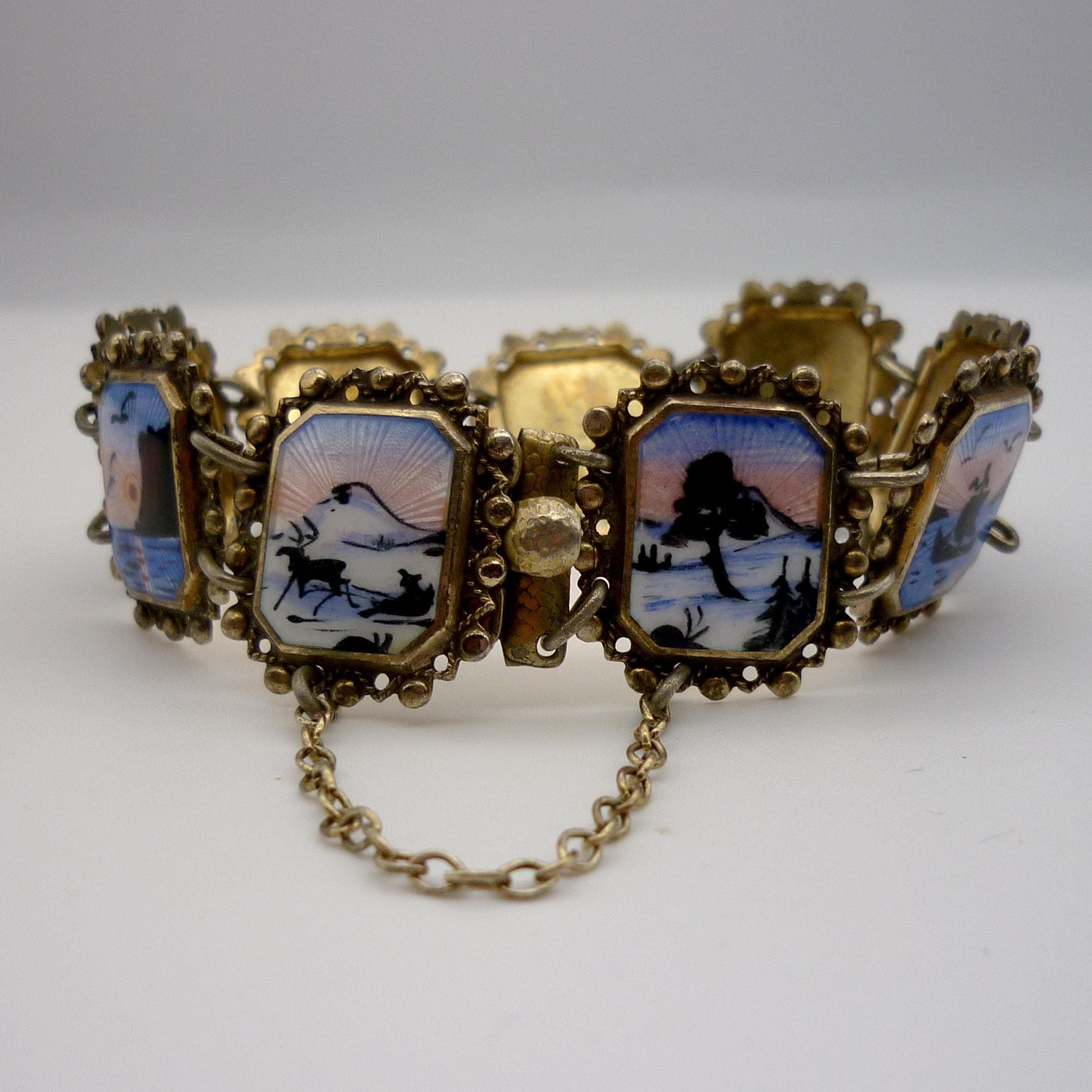 A very pretty vintage enamel on sterling silver bracelet made up of 9 panels, each set with miniature paintings of silhouetted nature scenes in front of a with a blue and pink tone setting sun.
