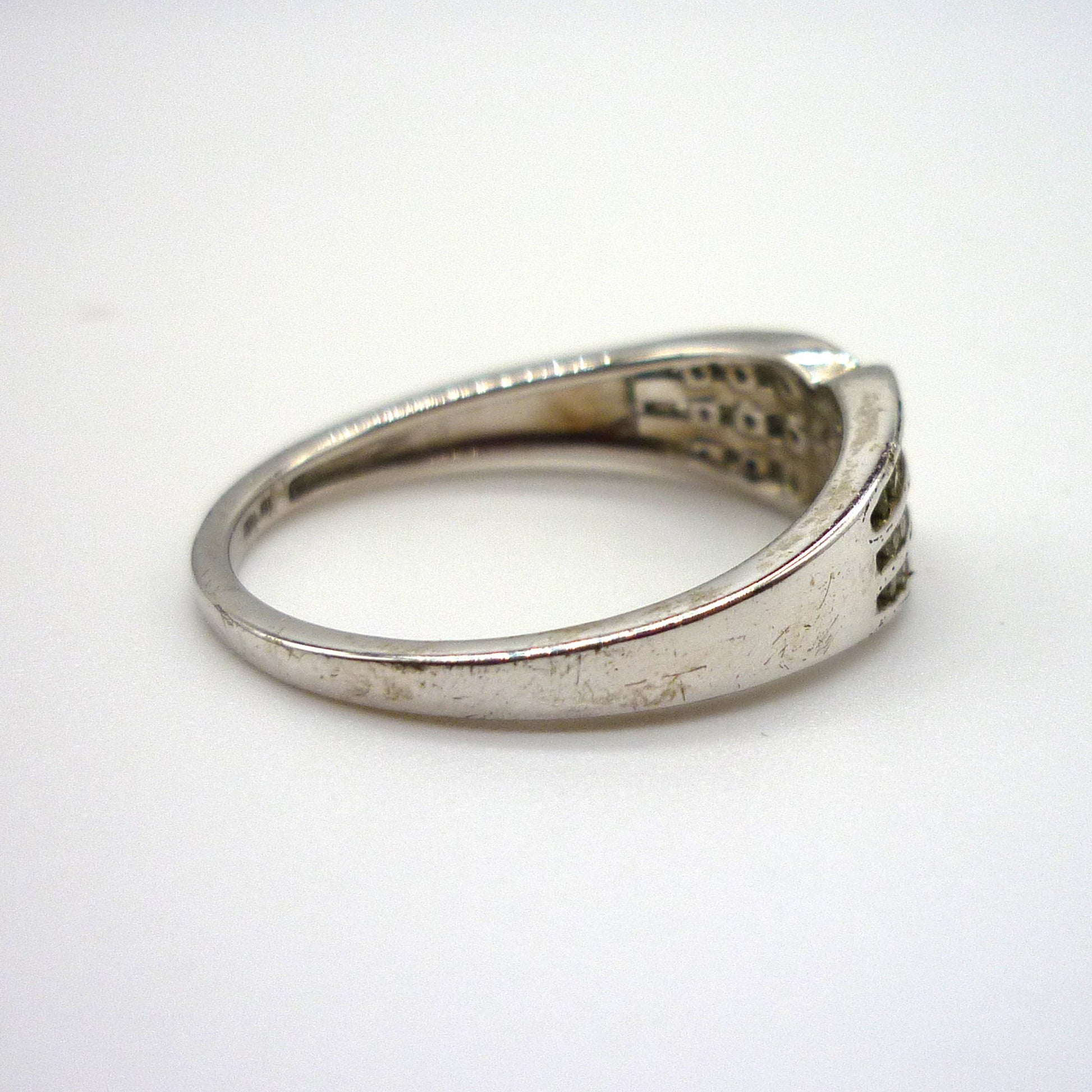 In good condition with light surface wear. The diamonds are very dull and of poor colour, almost grey, and heavily included. Approx. 6mm at widest point. Stamped 925 and TGGC