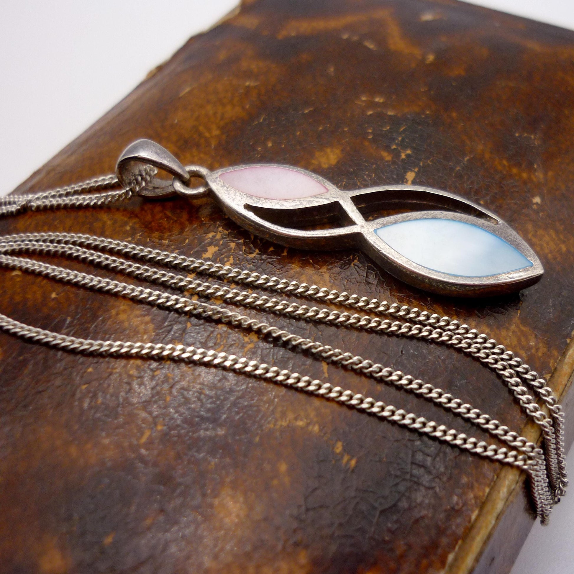 A dainty sterling silver pendant inlaid blue and pink mother of pearl on a vintage silver chain.