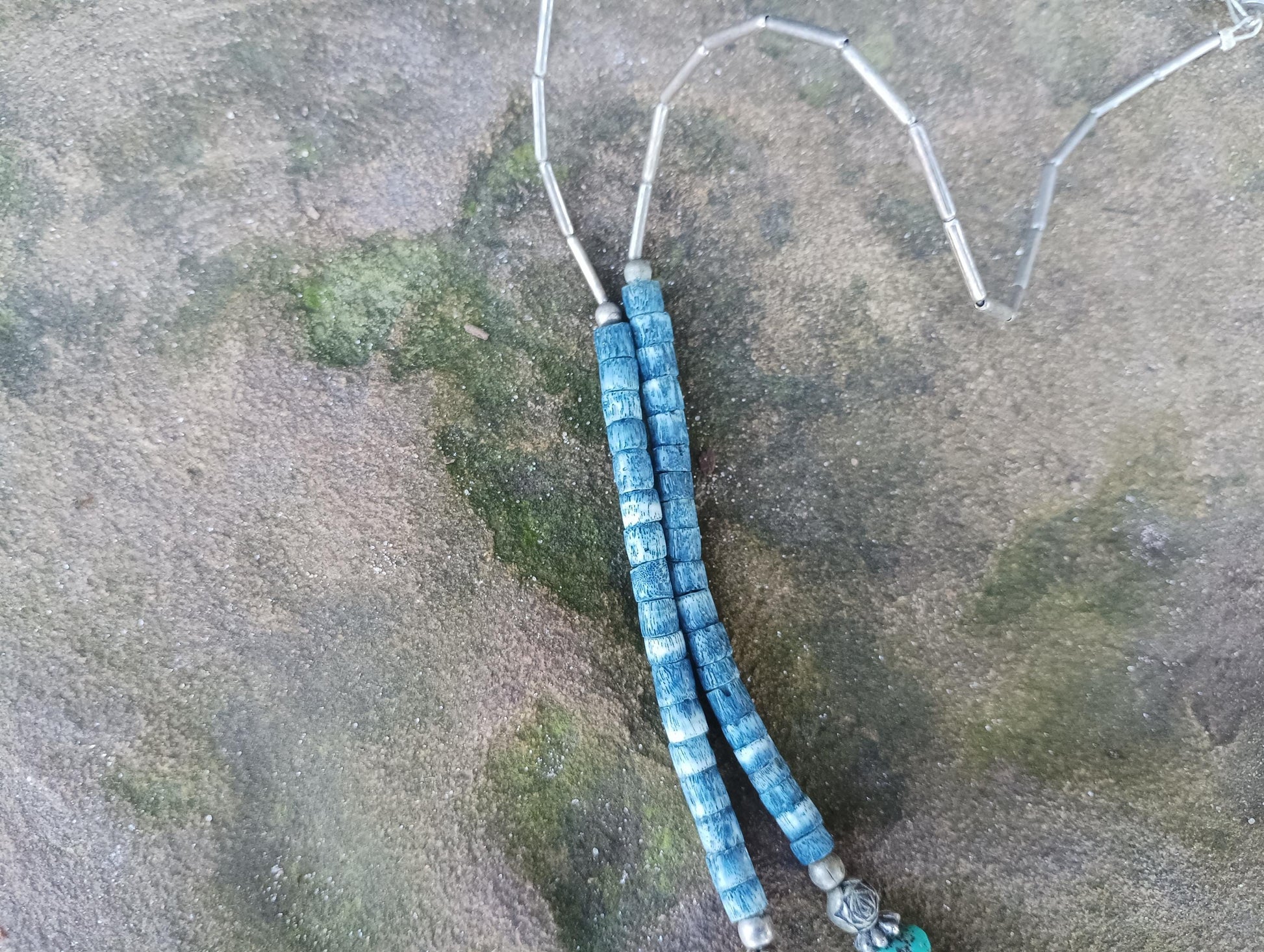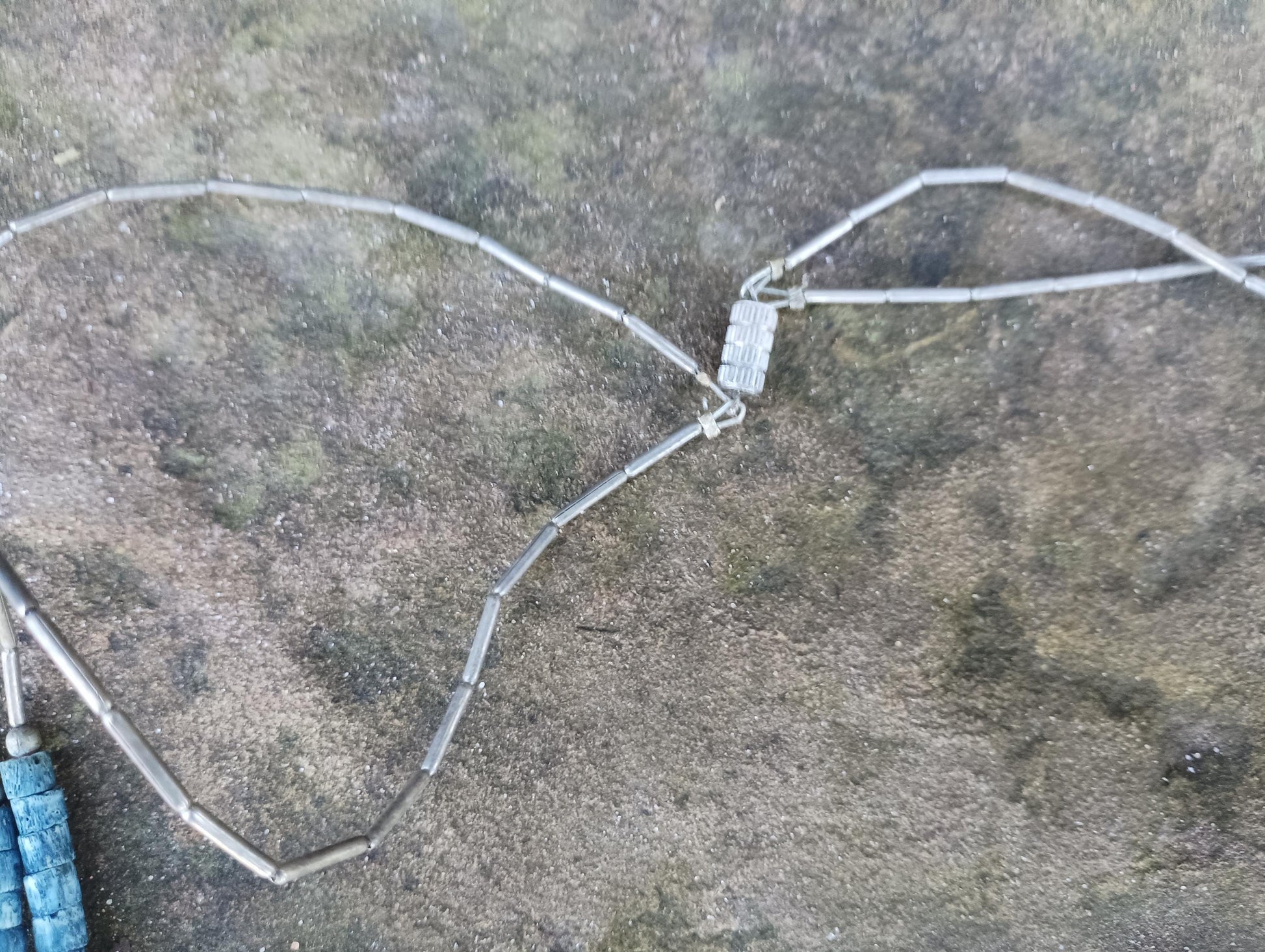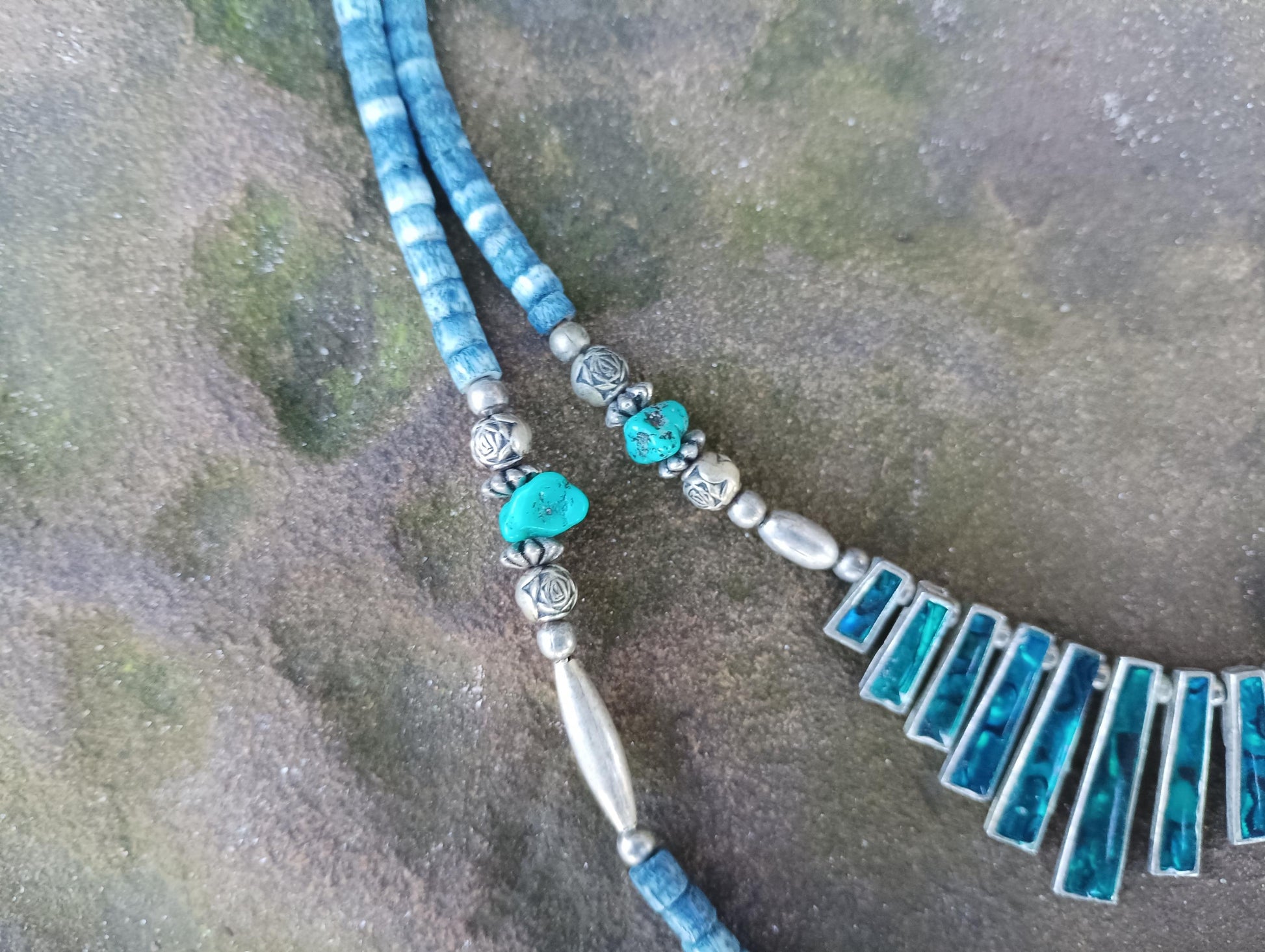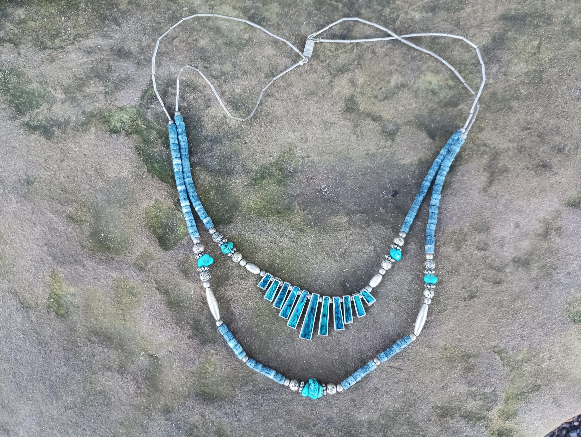 A vintage double strand Southwestern necklace with faux silver and turquoise beads. Beads are made from dyed howlite.