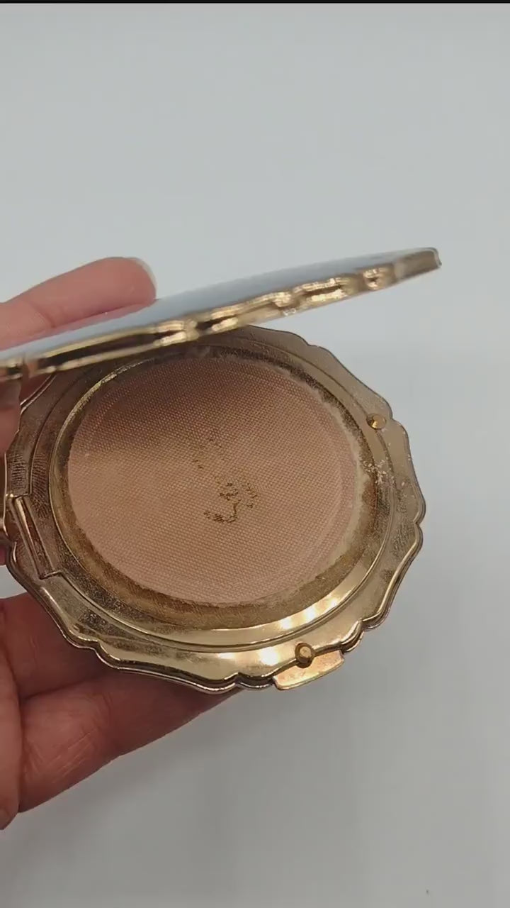 In good condition, there is overall surface wear to the lid and some heavy scuffs to the base as well as a few small marks to the mirror. Original sifter and a heavily used puff are both present with a residue of powder in the well.