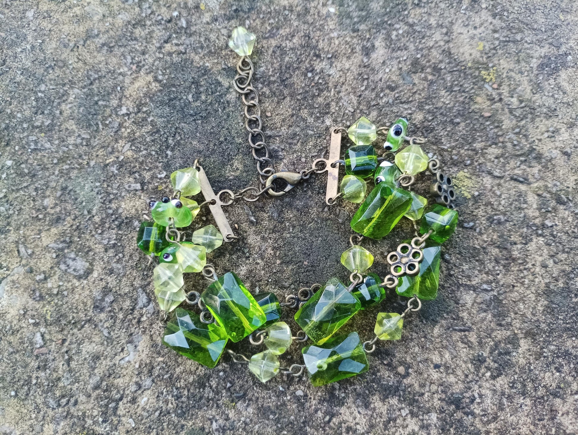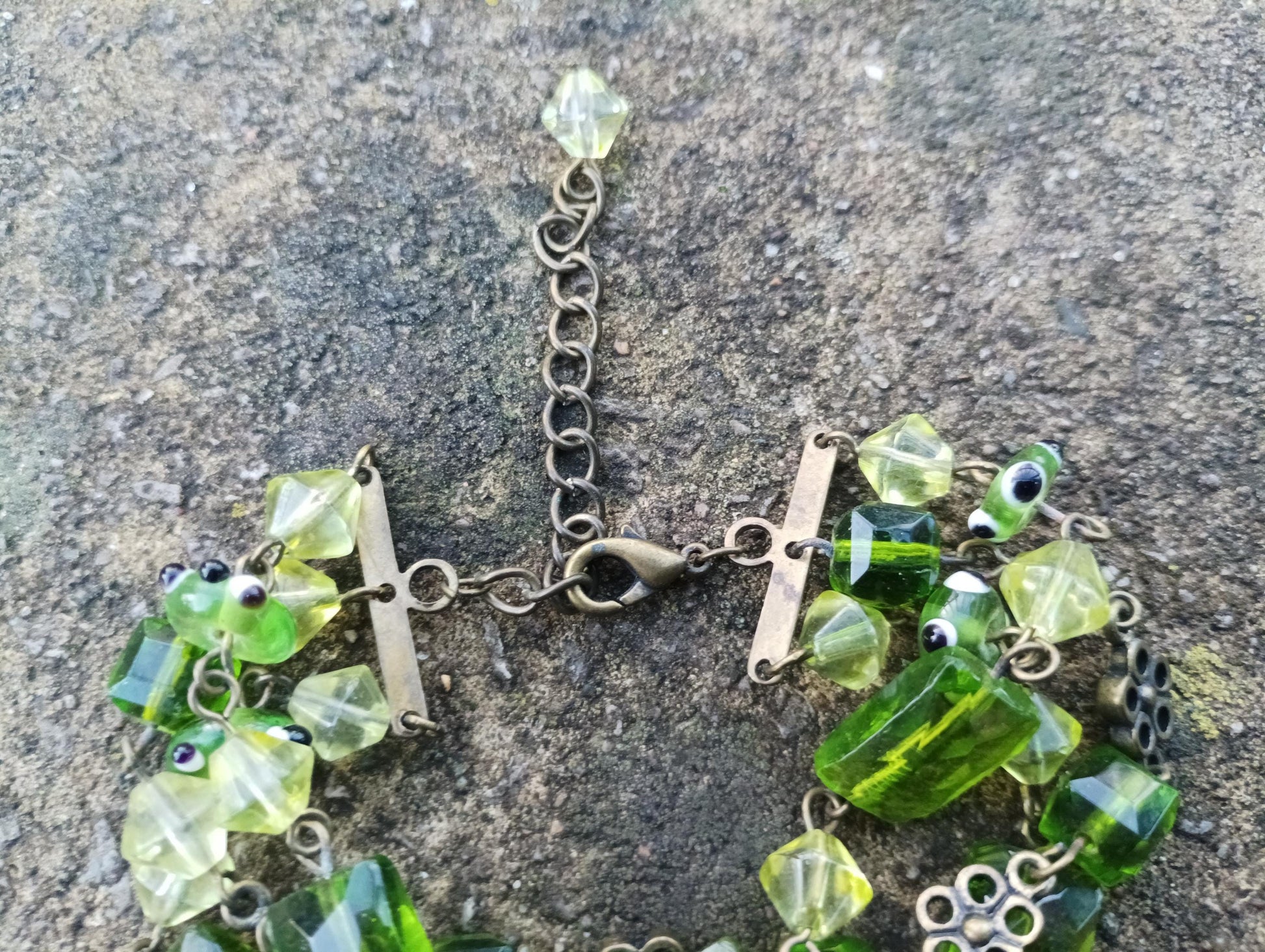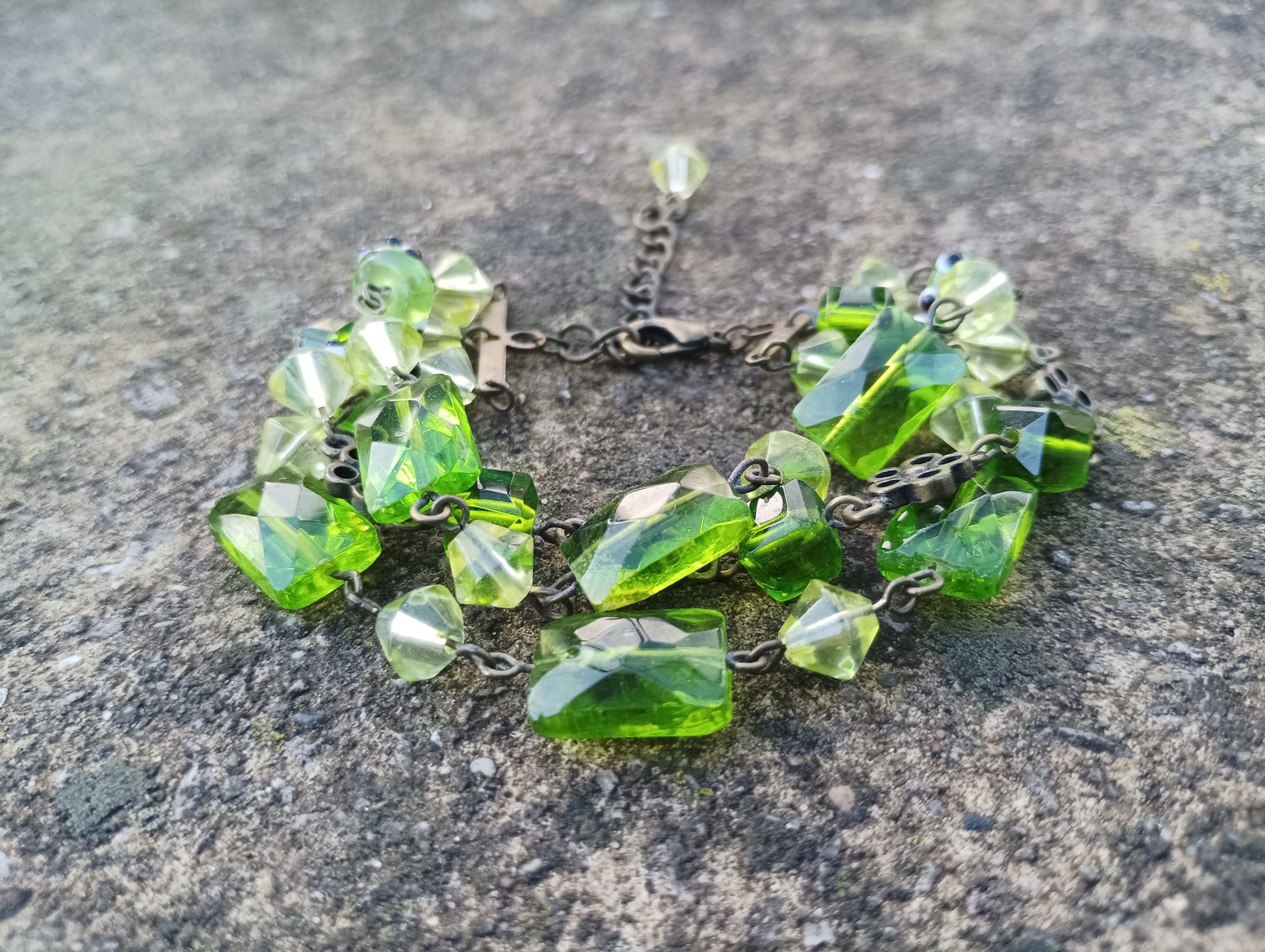 Vintage bracelet with faux peridot faceted glass stones in a brassy coloured metal with patina effect finish. Secured with a lobster claw clasp.